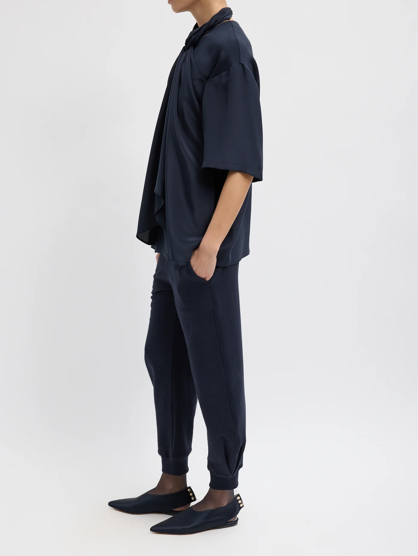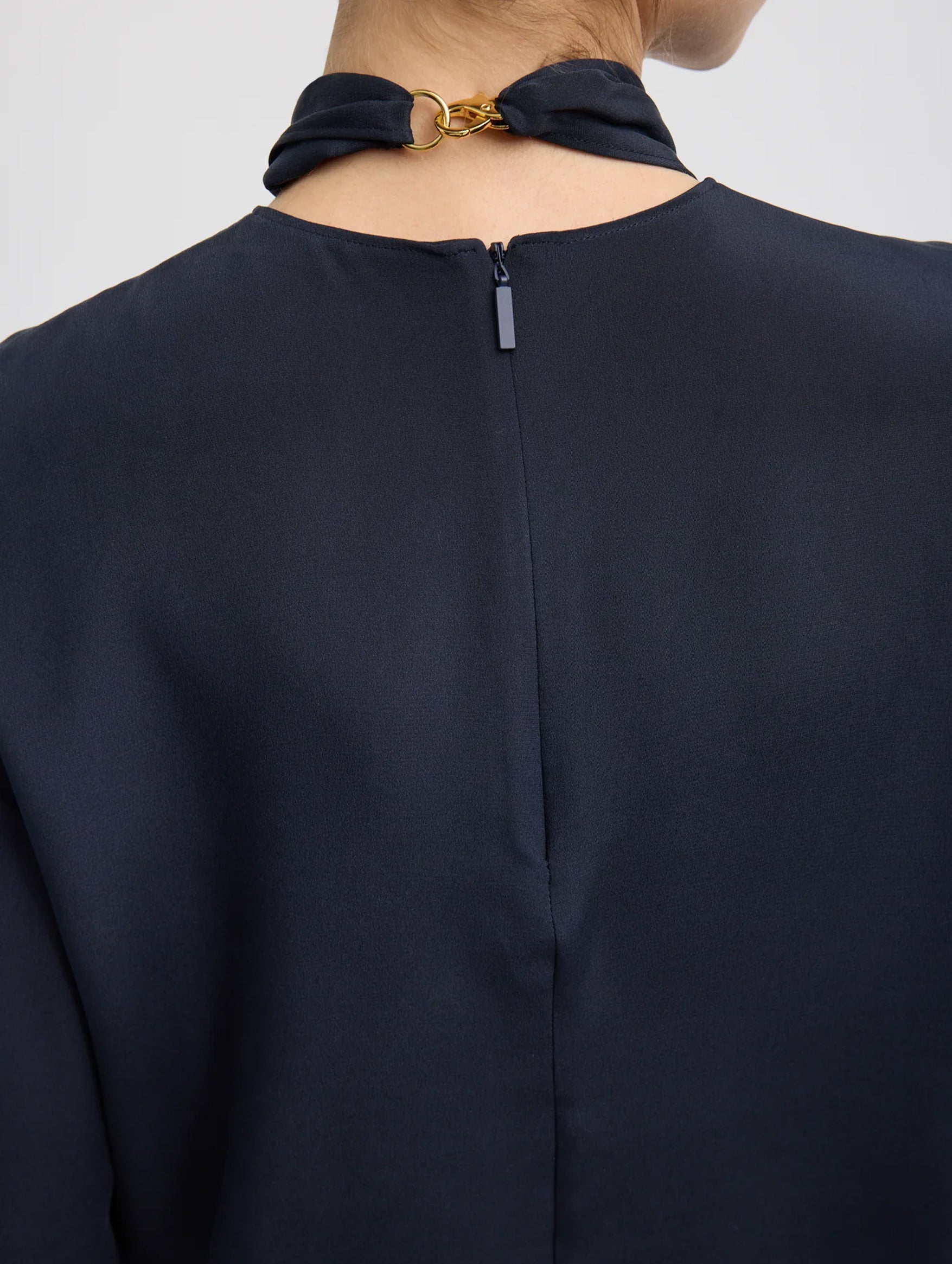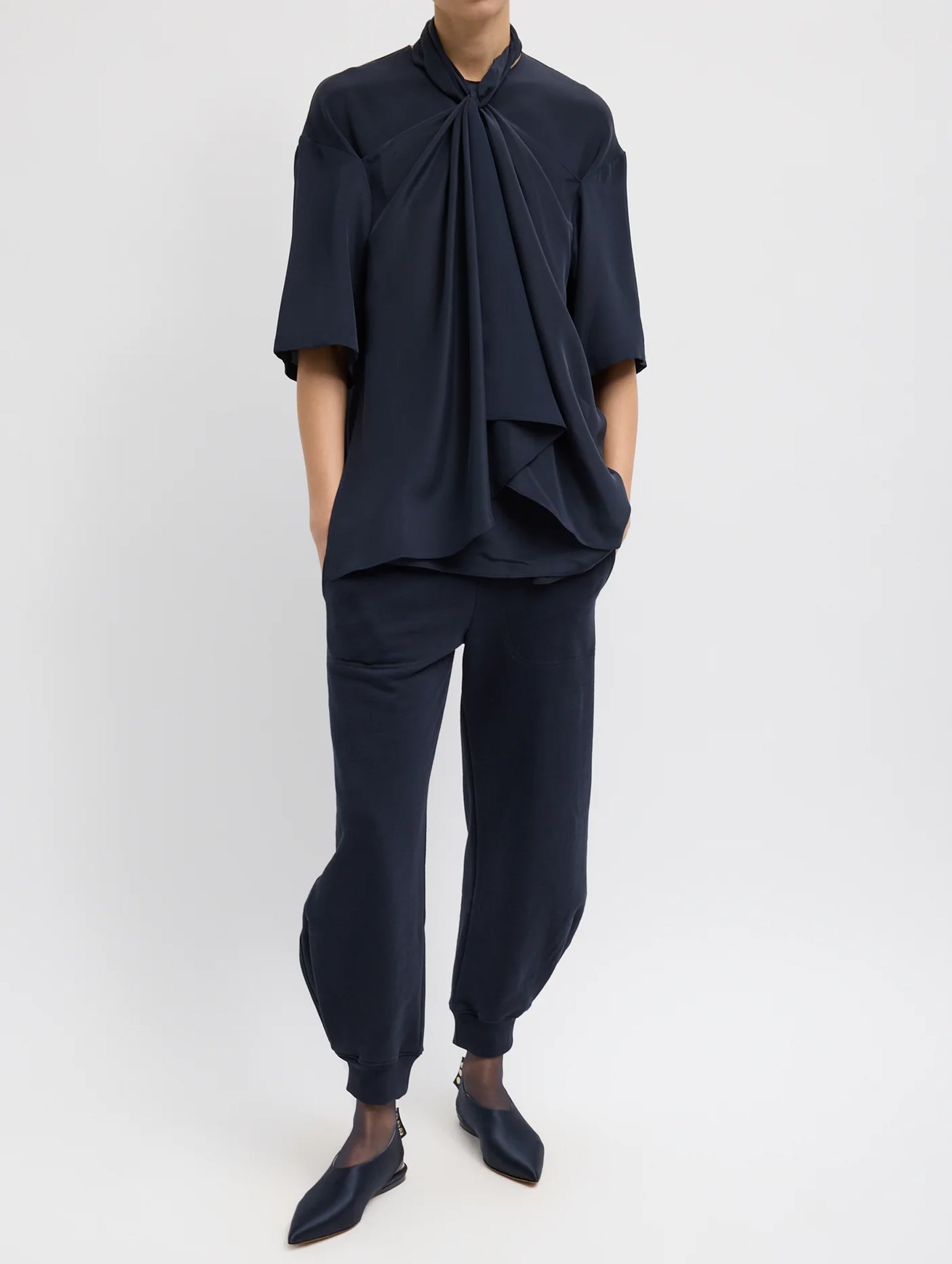 The Tibi 4 Ply Silk Tie Front Top in Navy is the epitome of elevated ease. Crafted from sustainably-produced four-ply silk, it features two draped ties that loop through the front and can be styled into a halter tie at the neck, an artful balance of structure and freedom. Whether tucked into tailored trousers or layered with sheer trousers for evening, this top is worn with confidence and refined simplicity.