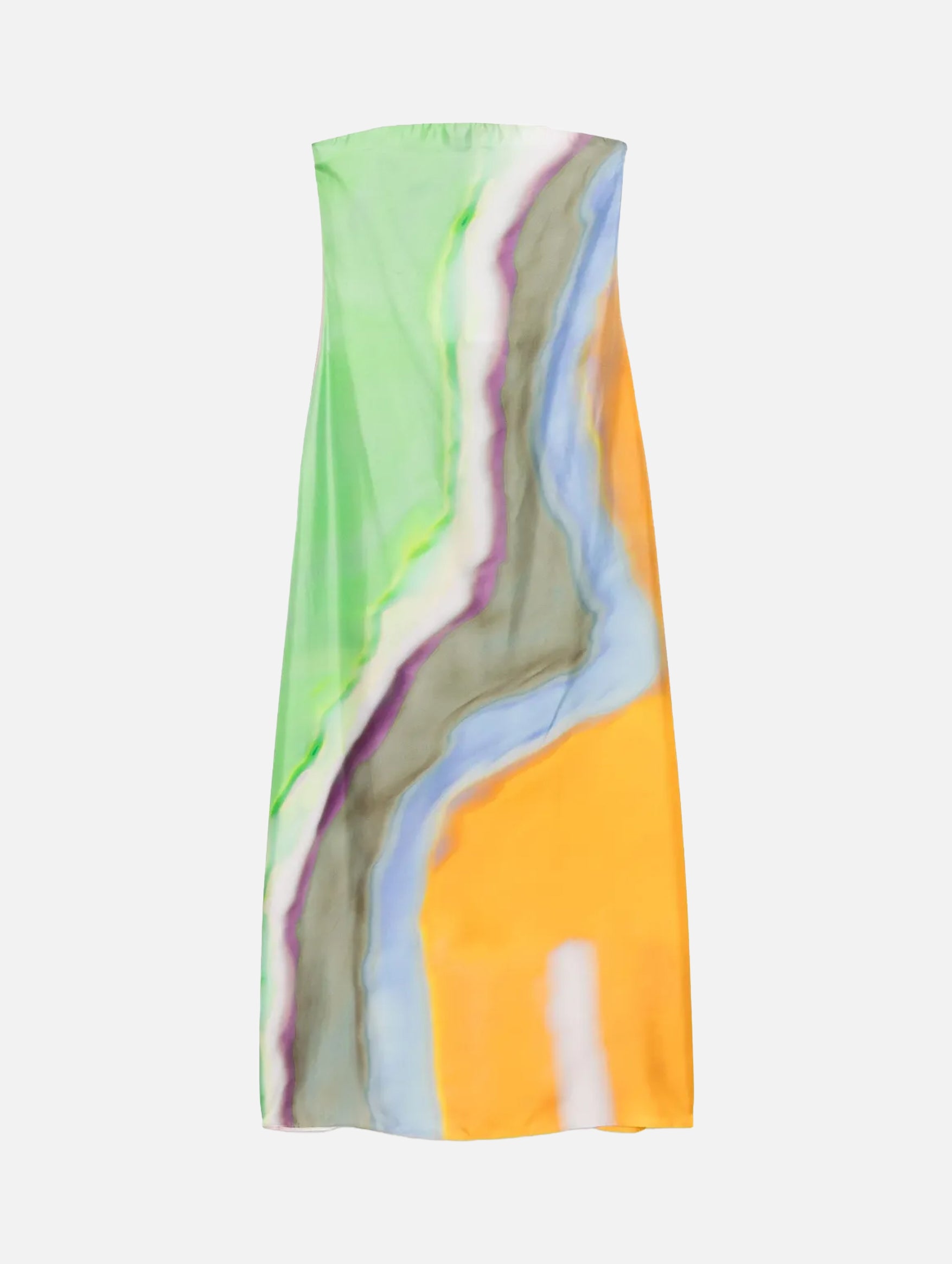 Crafted from fluid silk, the Aura Dress is a top-contender for your next special occasion. Crafted with a classic A-line shape and a strapless bodice and elegant full-length hem, rendered from a luxurious silk in a unique aura-inspired print to stand out. Beautiful in every way, style with heels and dainty jewellery.