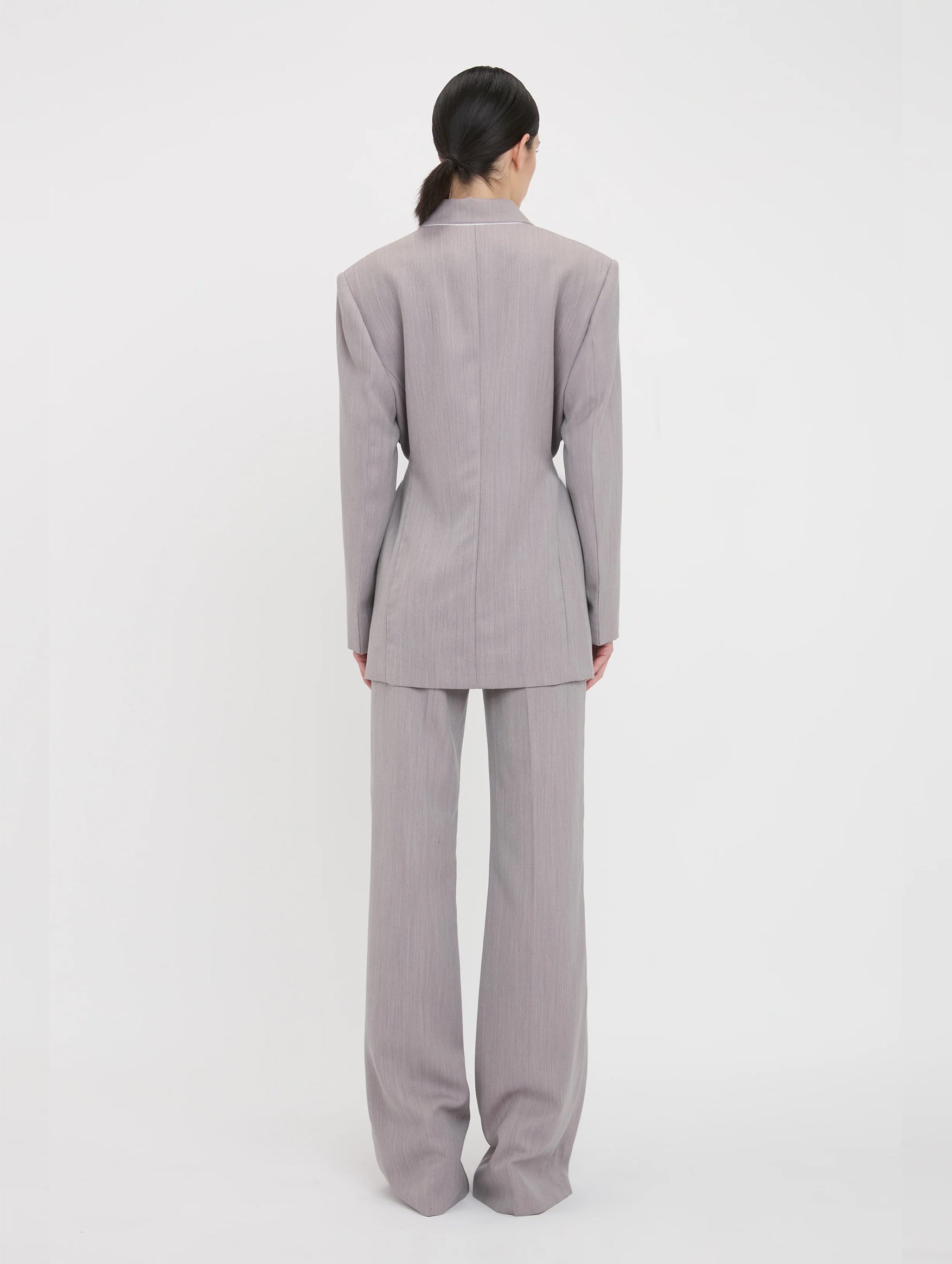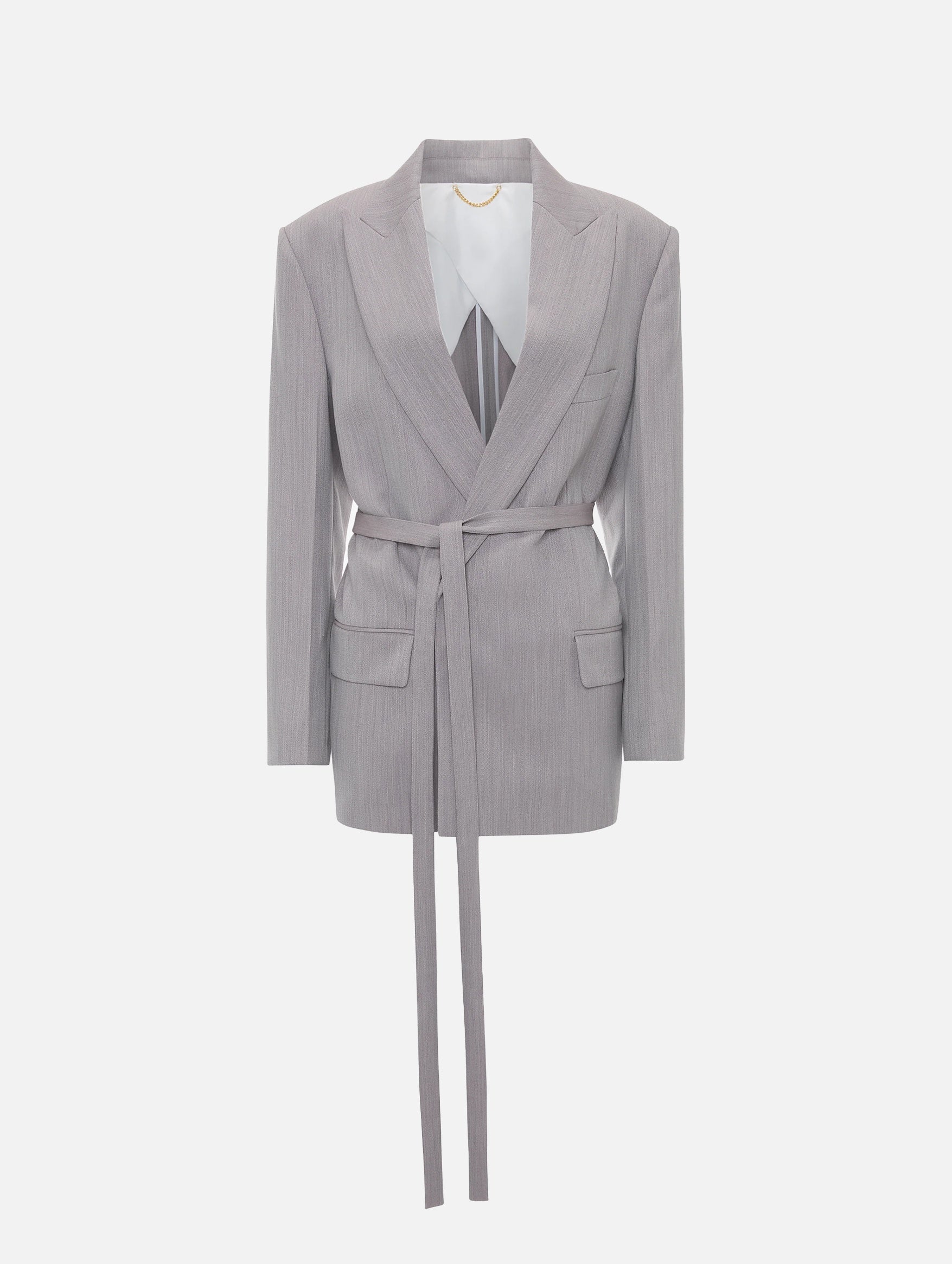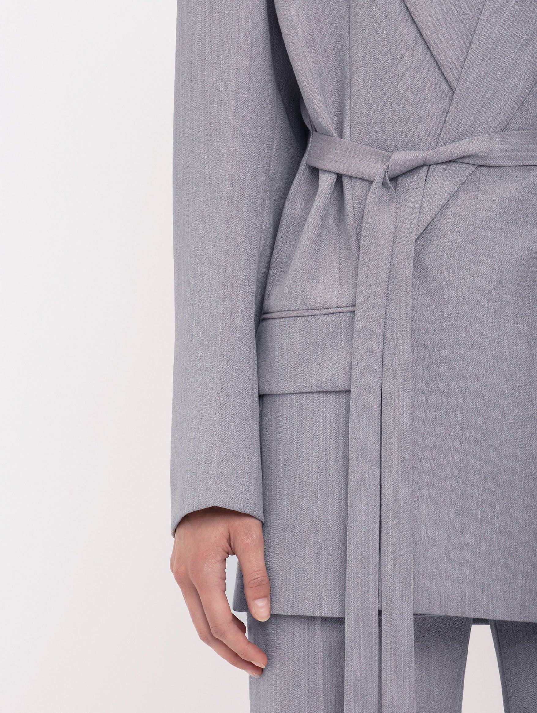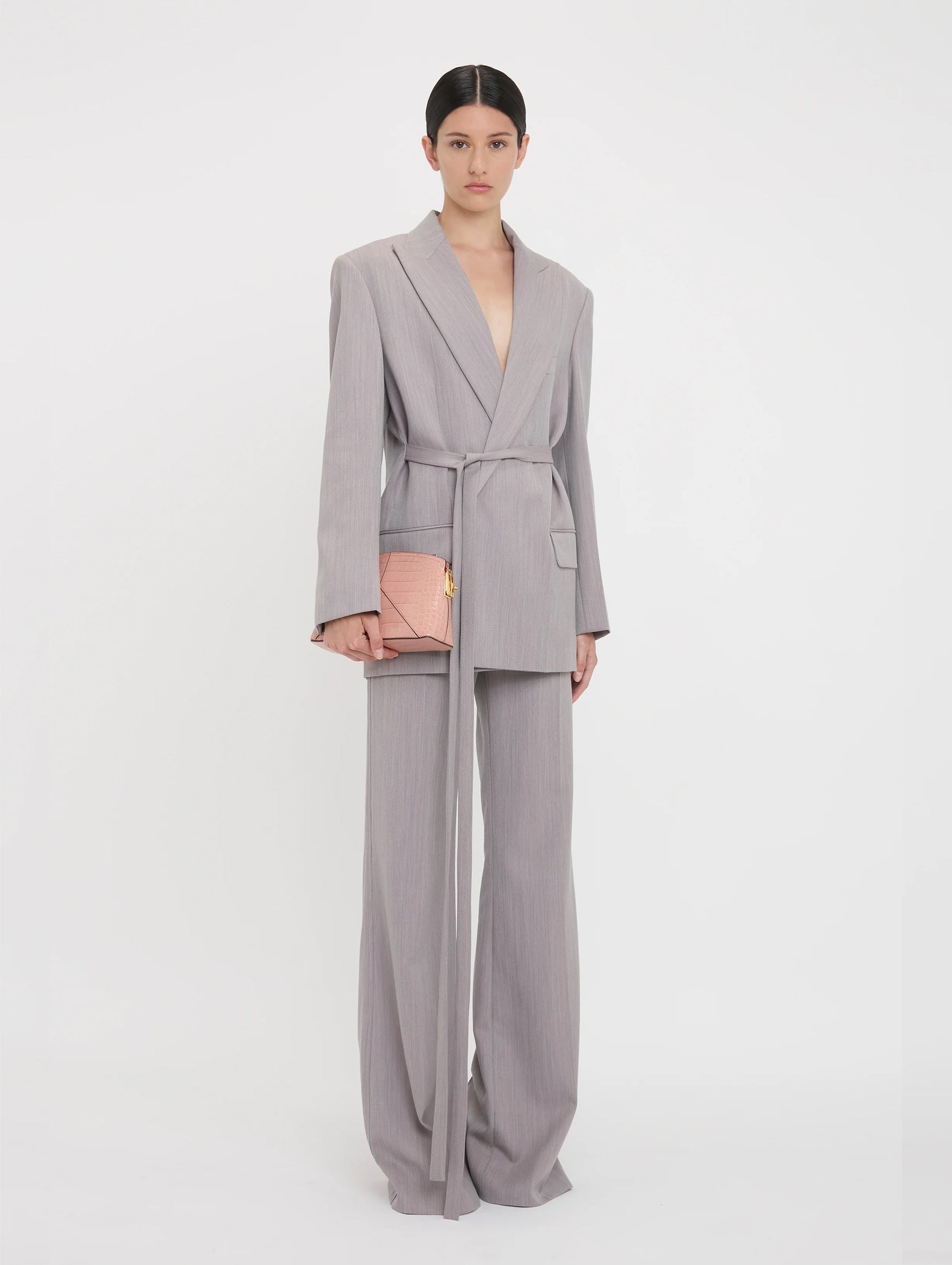 One of Victoria’s picks for SS25, the Belted Wool Jacket in Quartz embraces a feminine take on traditional suiting. A longer-length narrow fabric belt allows for versatile styling, creating a defined waistline when tied and elongating the silhouette with its ankle-grazing drop. Sharp creases down the front and back sleeves bring a hint of formality, while front patch pockets add an attractive and practical design detail.