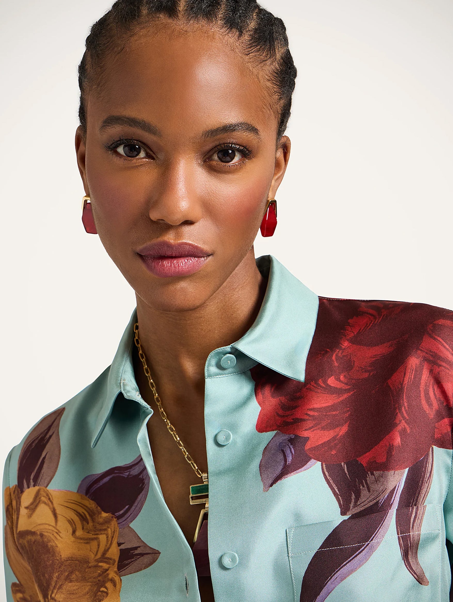 The La DoubleJ Boy Shirt in Peony Placée Light Blue reimagines classic tailoring with La DoubleJ’s signature addition of vibrance. Cut from fluid silk twill in Italy, it features a relaxed, straight fit, a hand-placed peony print, and silk-covered buttons for refined finish. Light, elegant, and effortlessly expressive, it’s a wearable nod to vintage romance and modern ease. Pair with the coordinating Palazzo Pants for a beautiful ensemble.