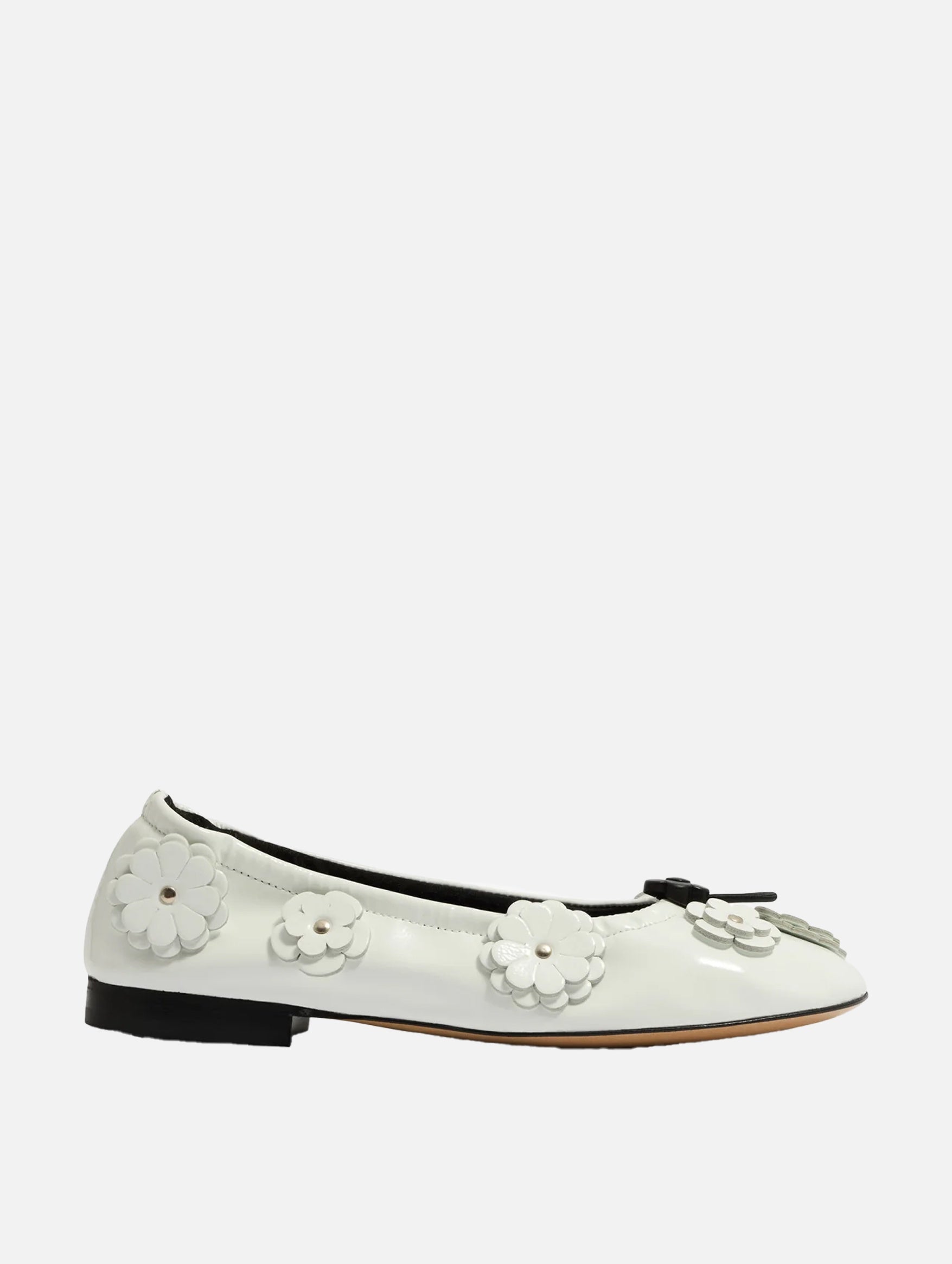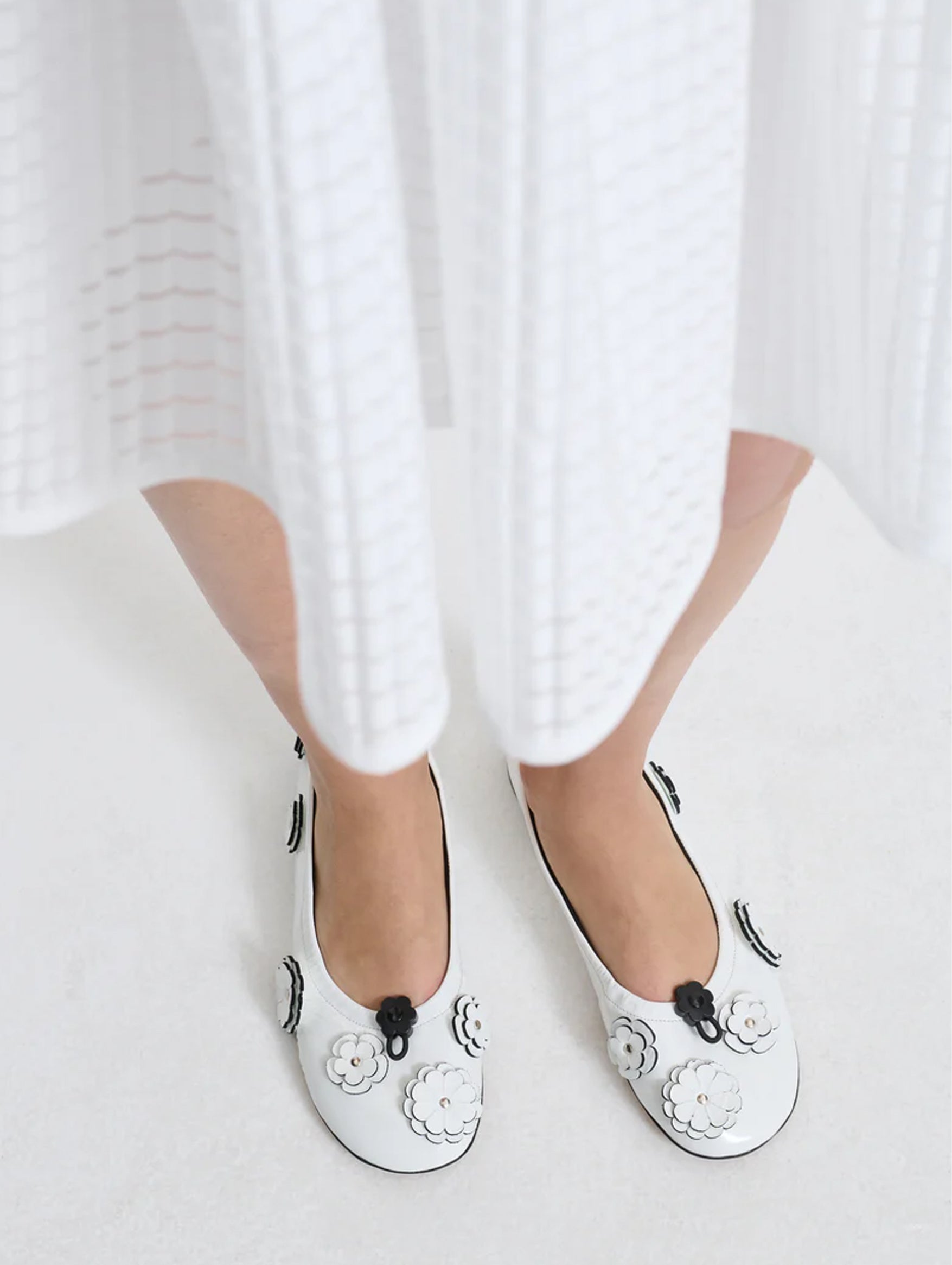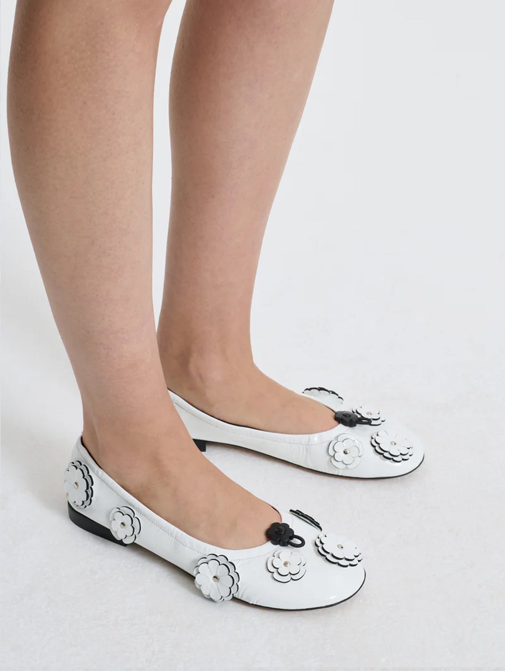 Where femininity and function, introducing Cecilie Bahsen's Brielle Flat in White. Crafted from patent leather, the ballerinas feature embroidered florals across the silhouette and a drawstring closure that can be tightened and locked to securely hold the foot in position, ensuring both comfort and stability with every step.