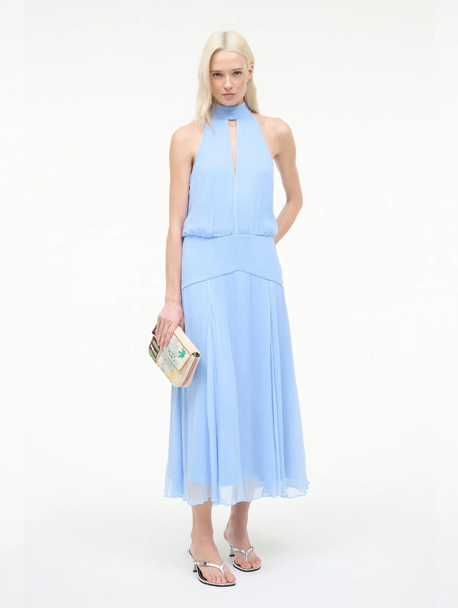 The STAUD Camryn Dress in Clear Blue is a fresh, sculptural take on summer dressing. Cut from lightweight fabric in a serene blue tone, it features a flattering neckline and a fluid silhouette that moves beautifully with every step. Wear it with minimalist sandals or elegant flats for a look that feels effortless, modern, and quietly refined.