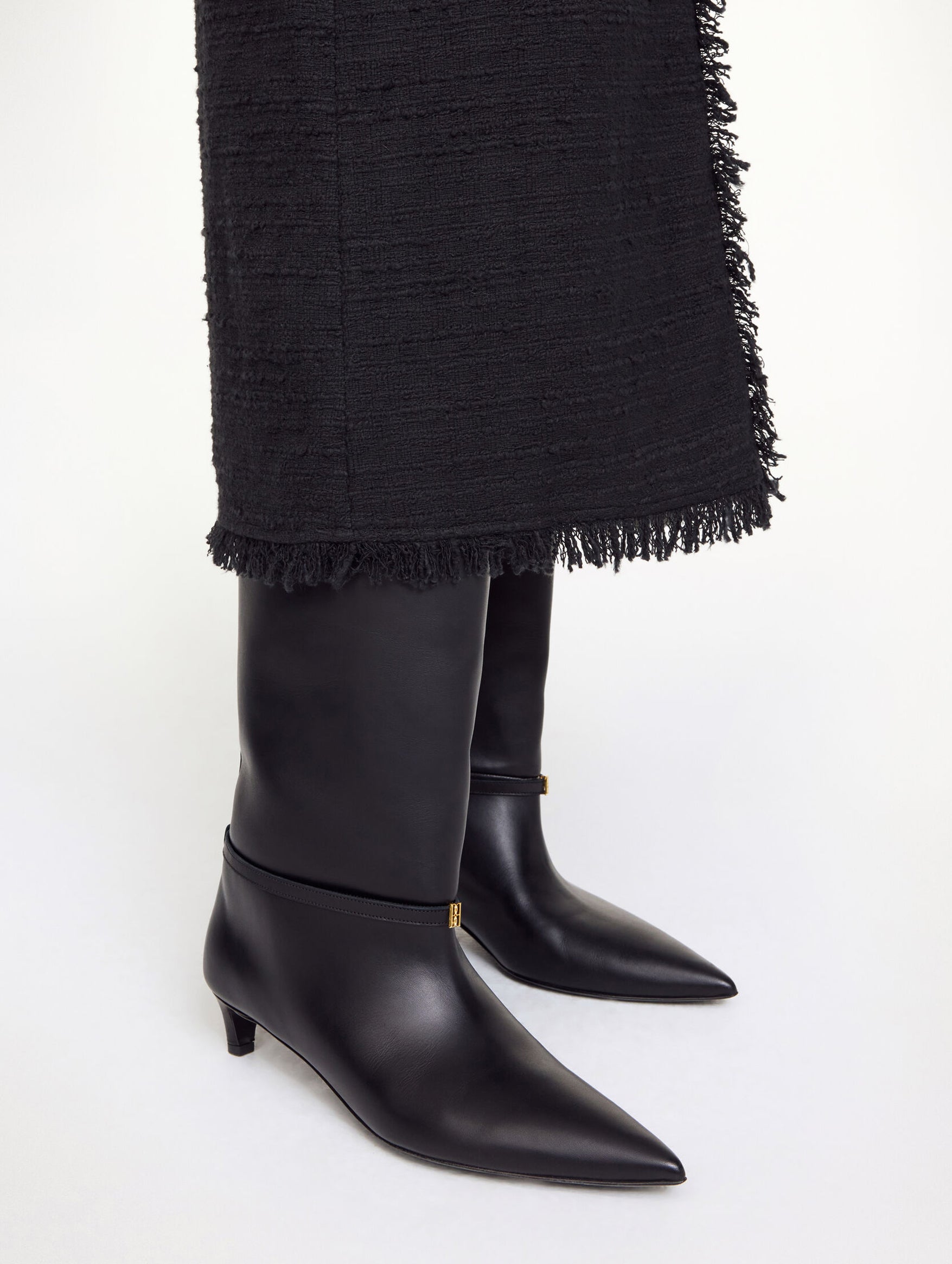 The Ceras Knee-High Leather Boots by By Malene Birger offer a timeless, architectural silhouette. Designed with a pointed toe and set atop a kitten heel, these boots feature a wide shaft complemented by a thin strap adorned with the brand's signature monogram motif. Pull tabs enhance functionality, while the low heel ensures comfort without compromising style. Whether paired with skirts, trousers, or dresses, the Ceras boots seamlessly integrate into various ensembles.
