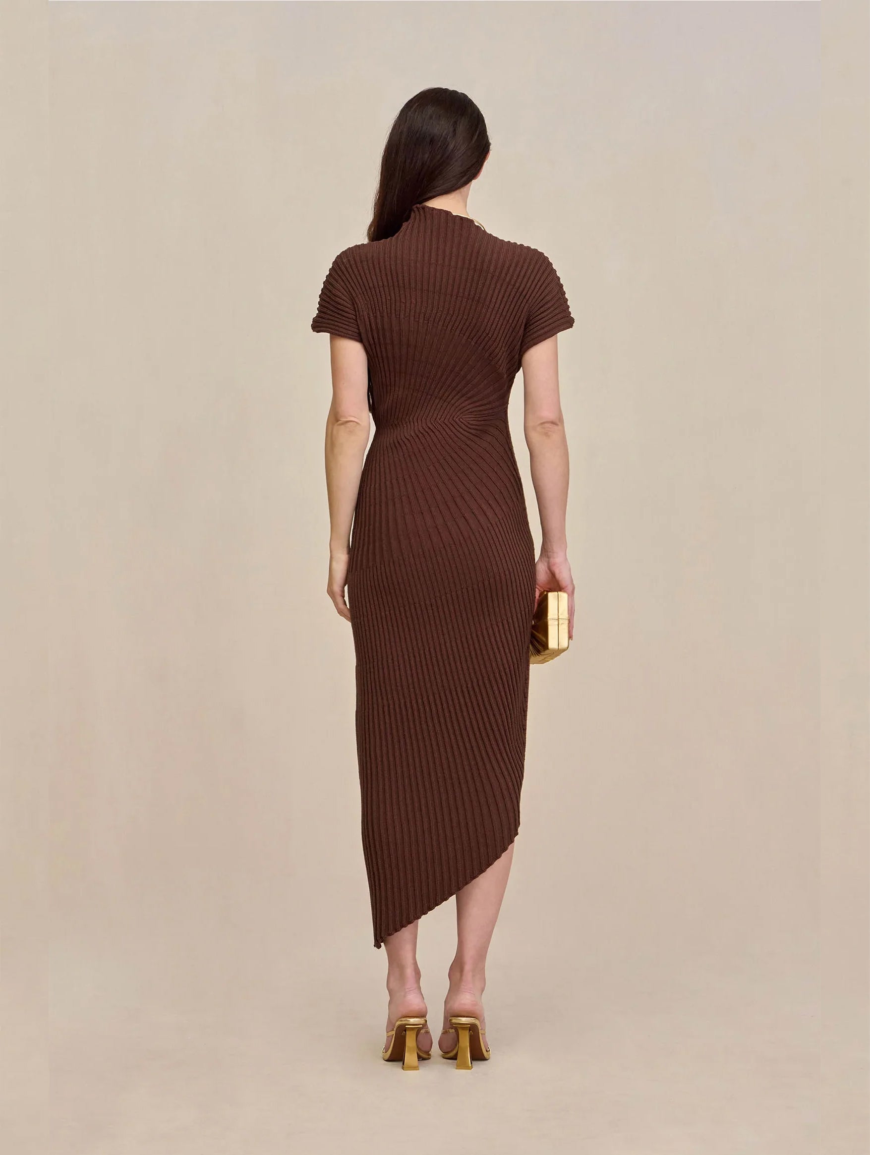 The Chrysta Knit Dress in Java from Cult Gaia is a sculptural take on minimalism, crafted with radial stitch detailing that elevates the silhouette. Featuring a unique asymmetrical mock neckline and a hemline that mirrors its shape, the design offers modern elegance with a directional edge. Perfect for day-to-night transitions, style it with tall boots or heels depending on the occasion.