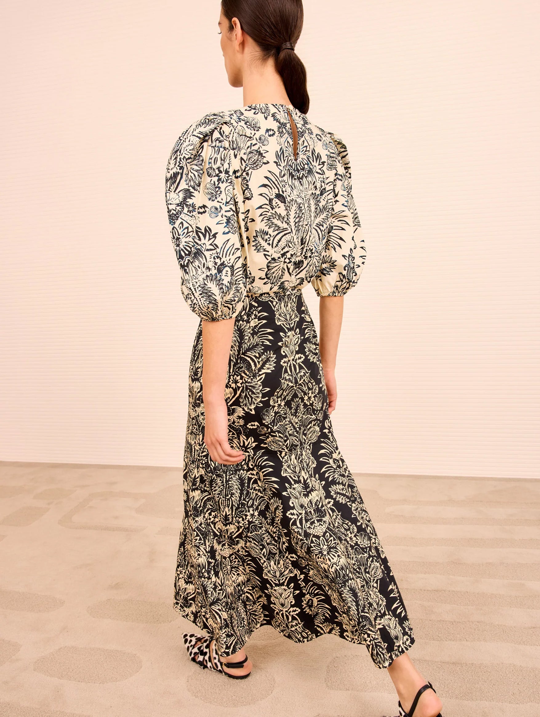 The Clarisse Trumpet Midi Skirt in Noir Flora from Ulla Johnson floats between structured elegance and relaxed grace. With its high-waisted silhouette and subtle godet detailing, the skirt blooms into motion beneath a black base layered with symmetrical floral leaf print. It’s a refined choice for modern dressing, pair it with a crisp blouse for daytime polish or a simple tee and boots for elevated weekend ease.