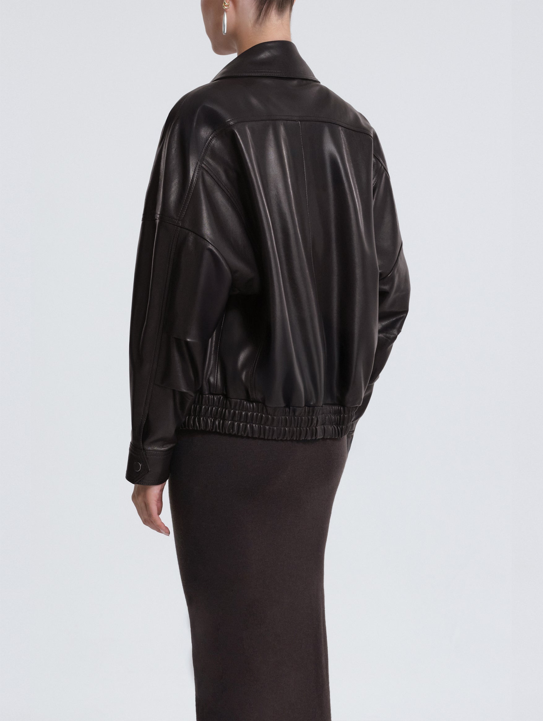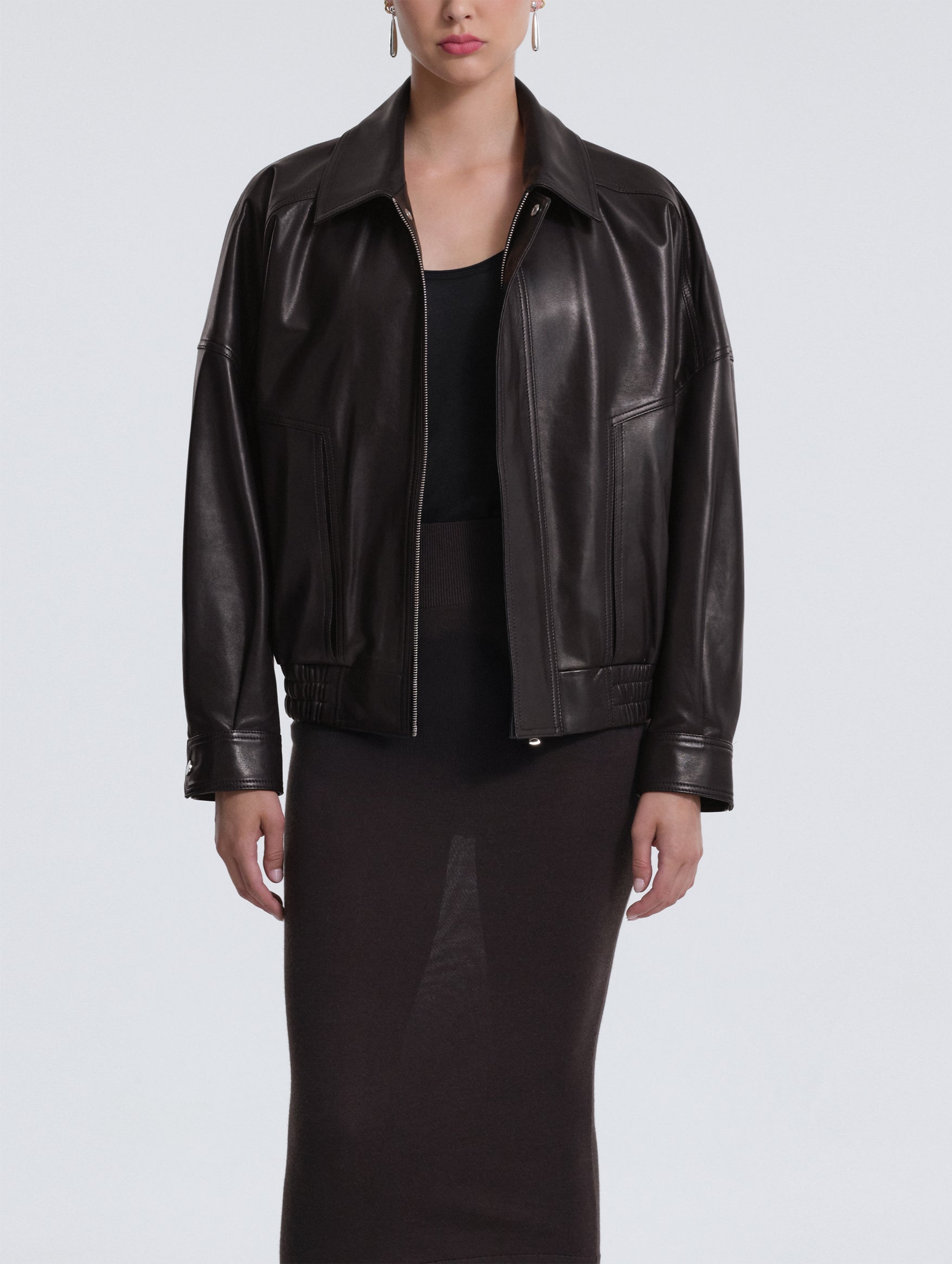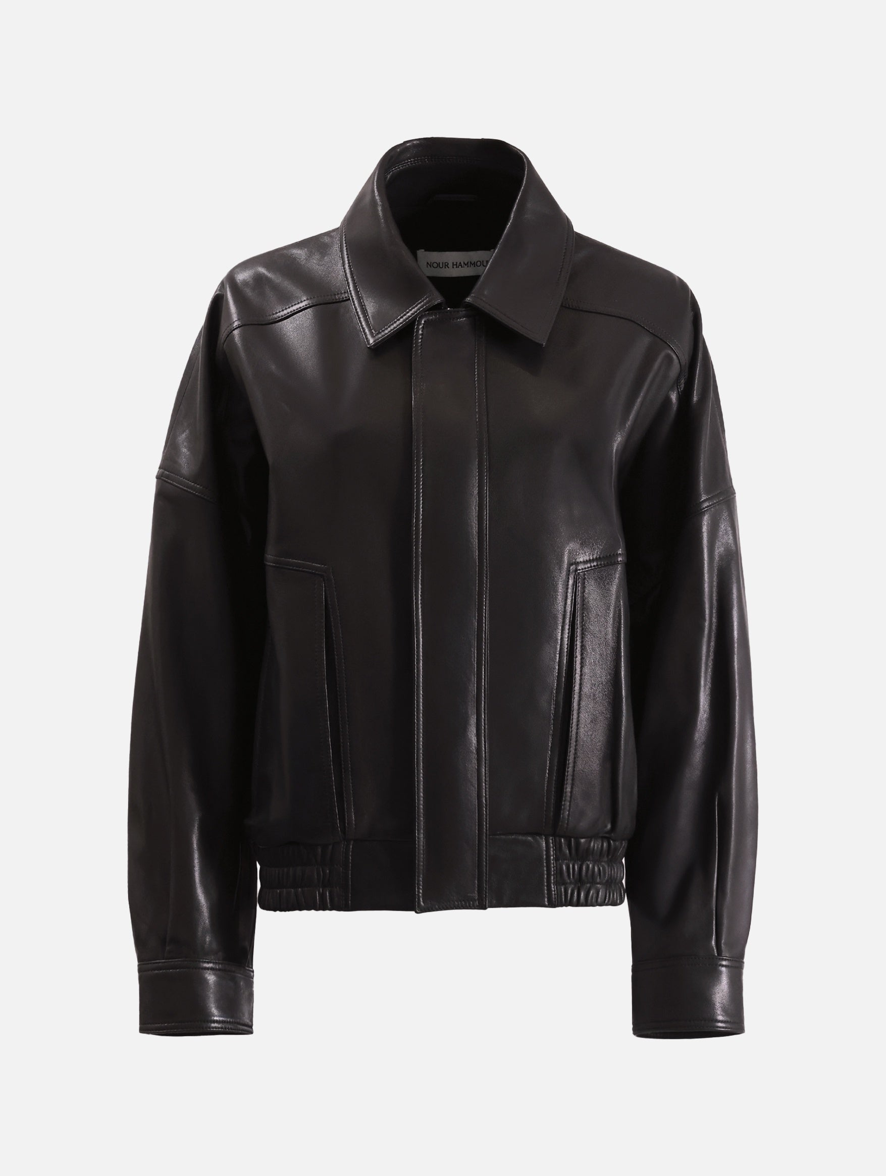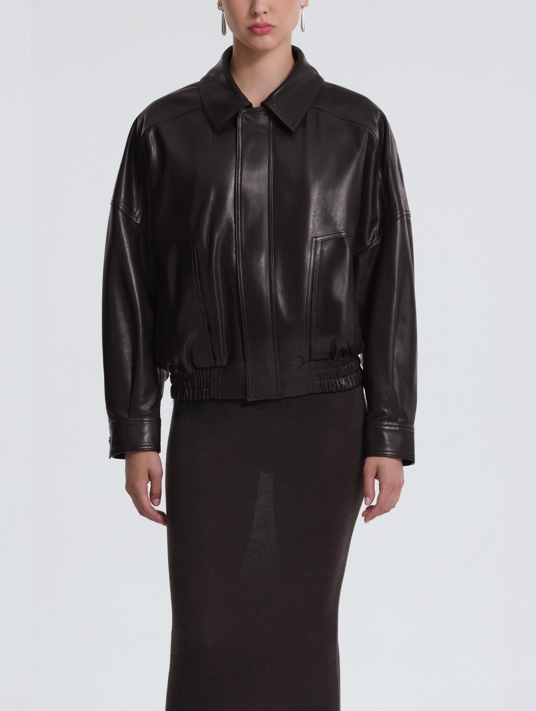 Softly structured yet inherently contemporary, the Dalma Leather Jacket in Dark Chocolate from Nour Hammour\ redefines the bomber silhouette with quiet elegance. Tailored from supple lambskin leather, it features a clean zip front, wide collar, and sleek welt pockets, grounded by an elasticated hem that shapes its relaxed profile. Fully lined and impeccably refined, it’s the tactile staple that marries timeless structure with modern ease.