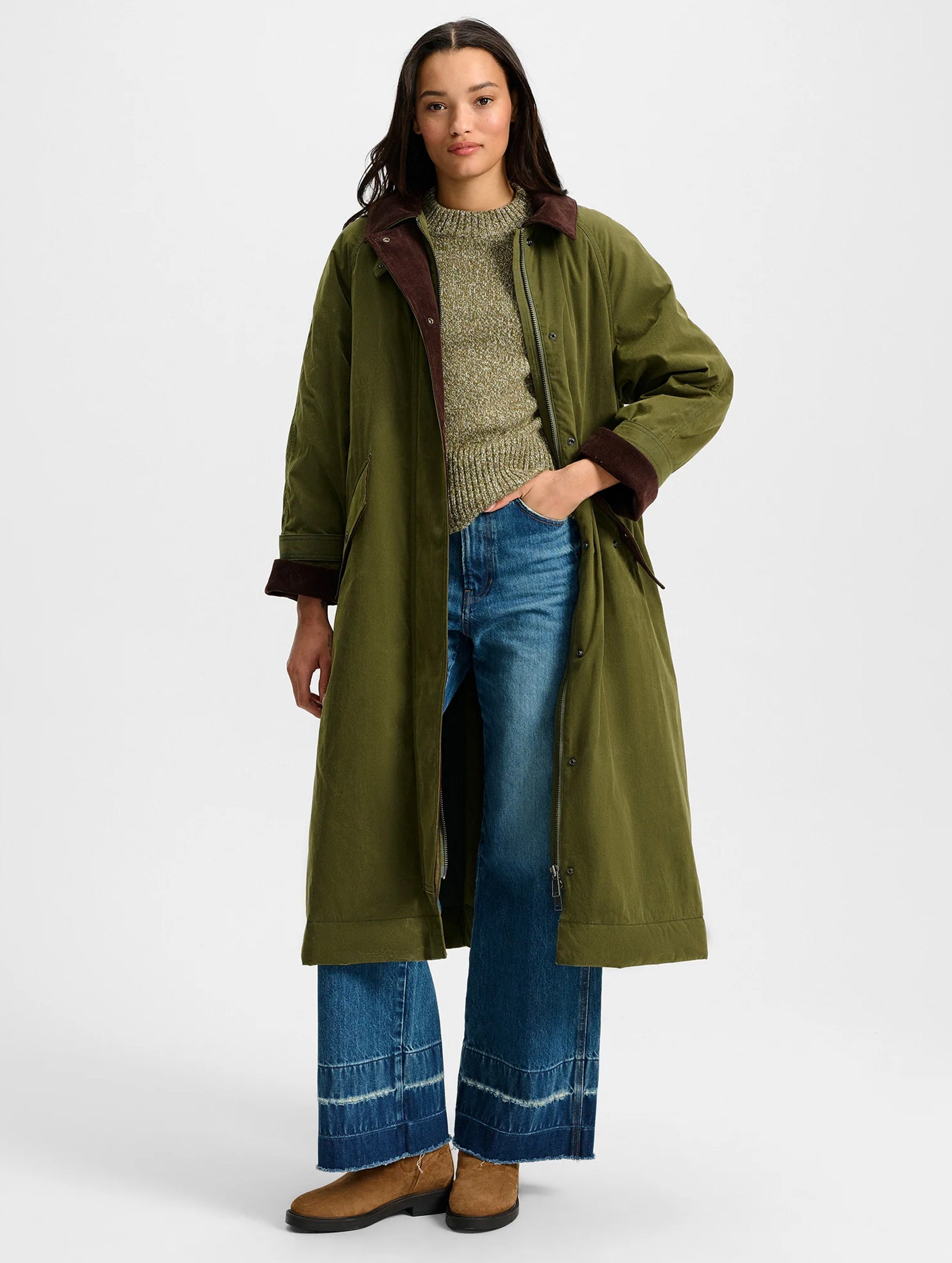 Your new go-to from Veronica Beard, the Dietz is an elongated field coat that brings a polished finish to a utilitarian classic. Wax-coated for durability and finished with a traditional storm flap at the back, it’s built for layering. Slanted flap pockets, a concealed front zip, and contrast corduroy at the collar and cuffs finish the look. Designed to work overtime in colder months, just layer over anything in your closet.