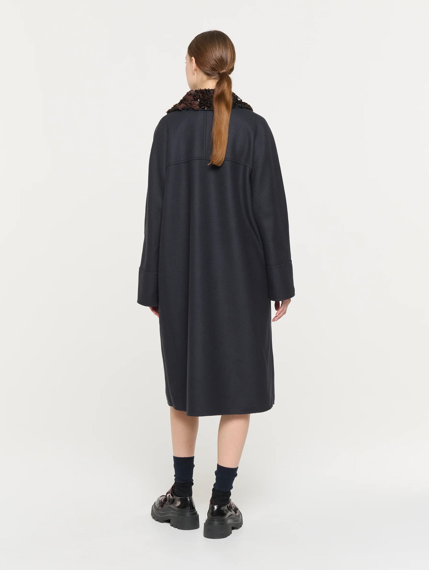 Wrap yourself in refined drama with this Double-Breasted Coat from Plan C. Woven in a sumptuous wool blend that whispers of luxury, its relaxed silhouette is elevated by a detachable sequin-embroidered collar for a dash of evening glamour. Long sleeves, patch pockets, and a graceful back slit accentuate the coat’s tailored ease, while the fully-lined interior ensures comfort with every wear. Made in Italy, this piece transitions effortlessly from polished daywear to statement evening outerwear.