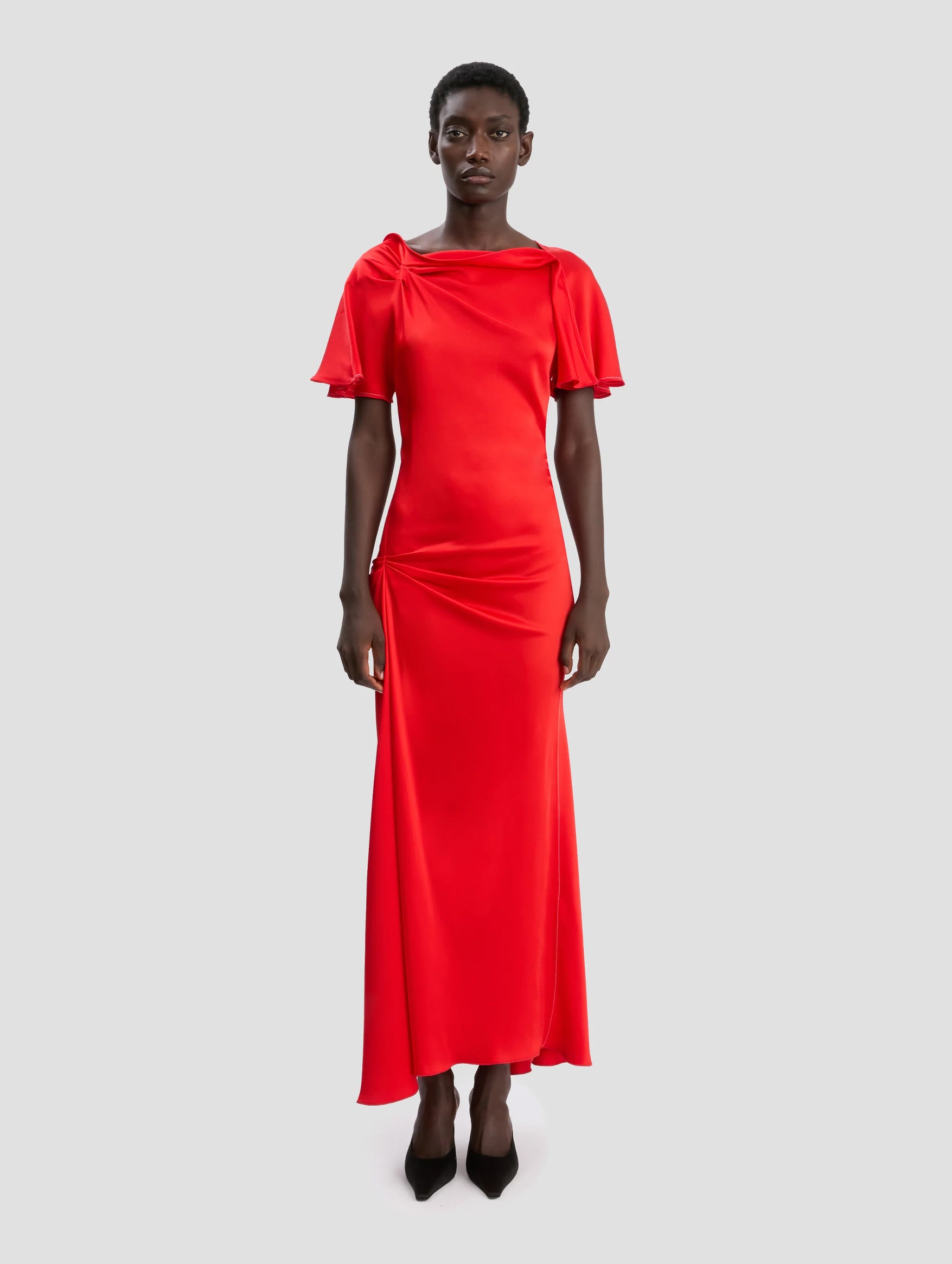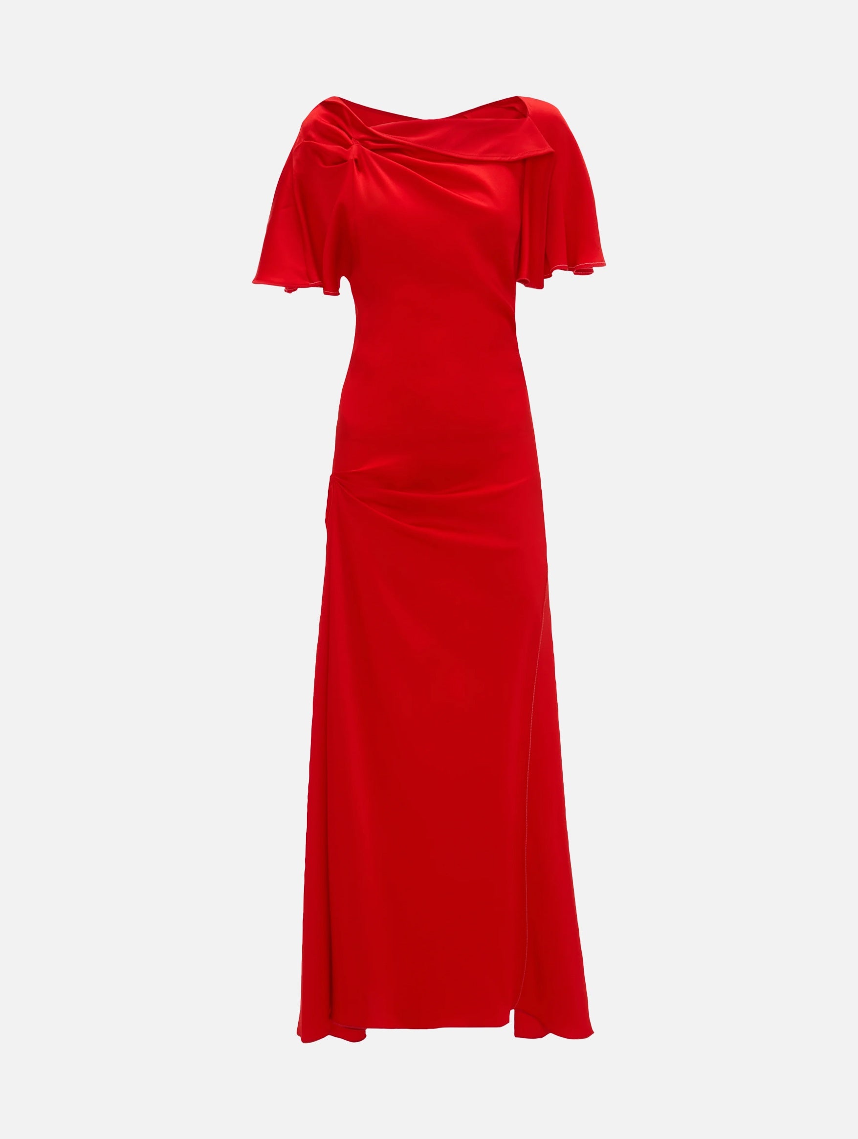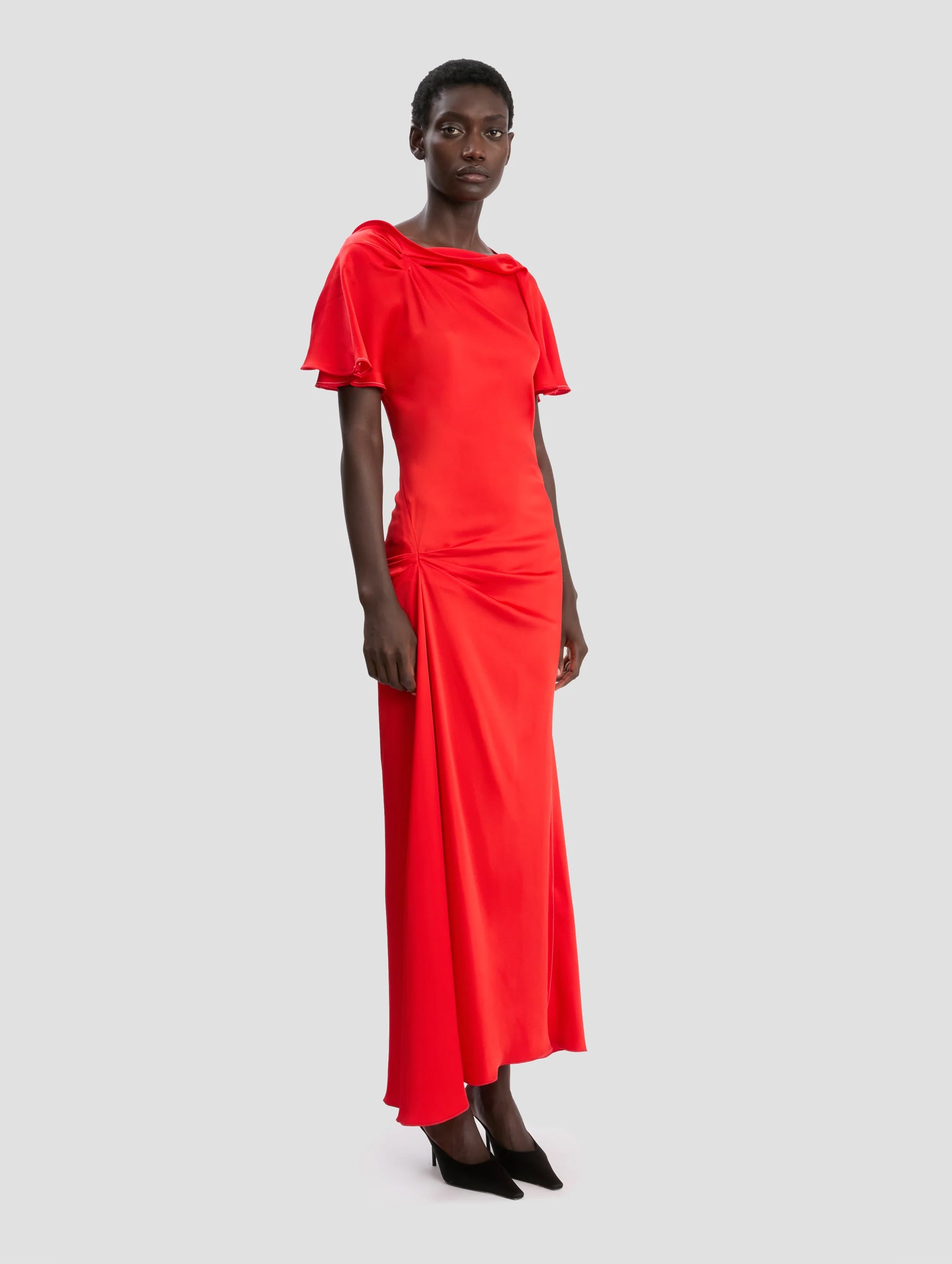 The crepe back satin fabrication and distinctive draping at the neckline and sleeves bring a tactile quality to Victoria Beckham's Draped Cap Sleeve Dress in Cayenne. Fitted at the bodice, waist and hem, with a fluid skirt, it has a feminine sensibility enhanced by a pleat detail at the shoulder and skirt. Cord piping at the neckline adds a contemporary talking point, while a directional asymmetric hemline completes the look.