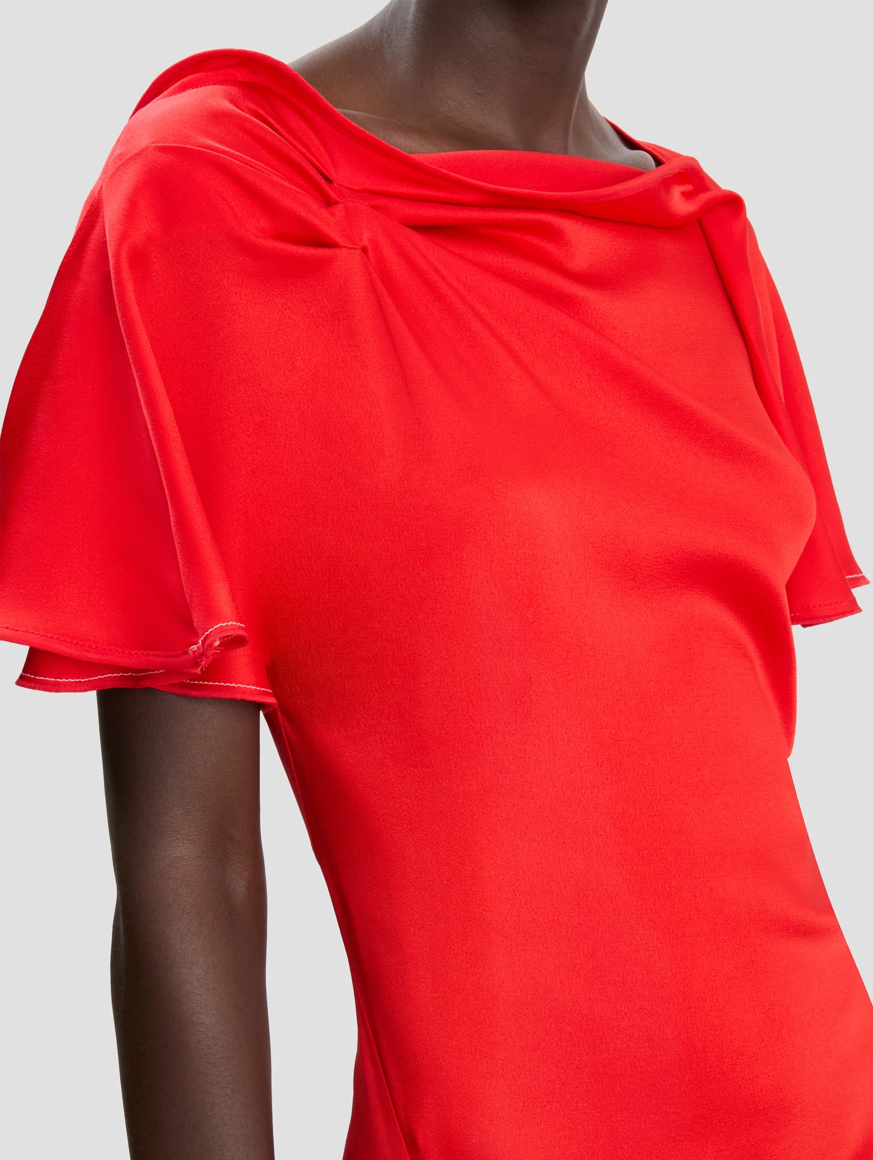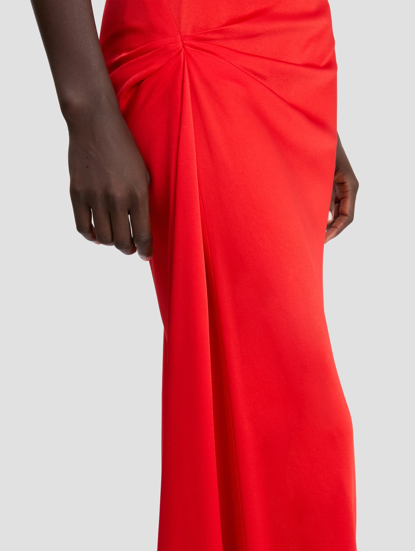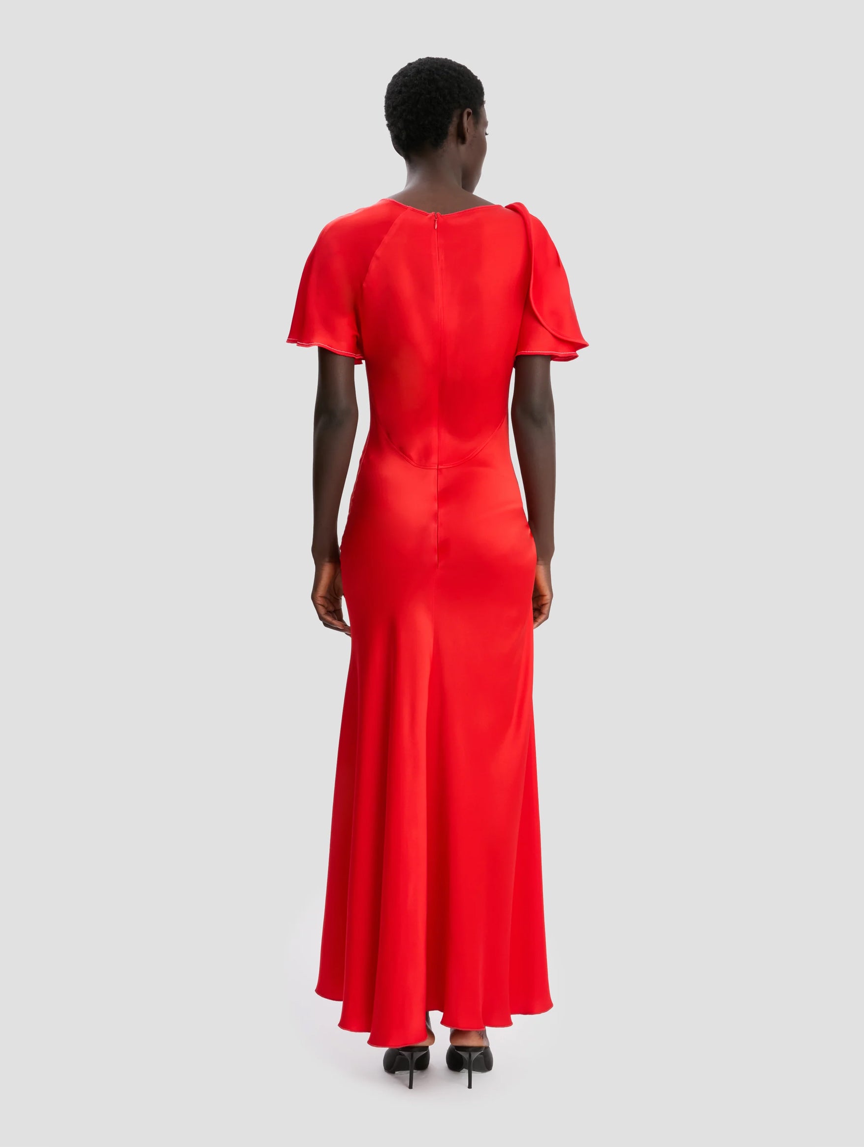 The crepe back satin fabrication and distinctive draping at the neckline and sleeves bring a tactile quality to Victoria Beckham's Draped Cap Sleeve Dress in Cayenne. Fitted at the bodice, waist and hem, with a fluid skirt, it has a feminine sensibility enhanced by a pleat detail at the shoulder and skirt. Cord piping at the neckline adds a contemporary talking point, while a directional asymmetric hemline completes the look.