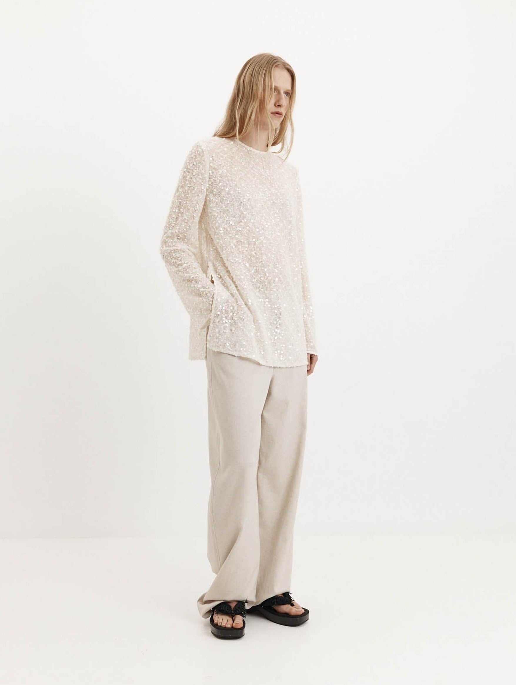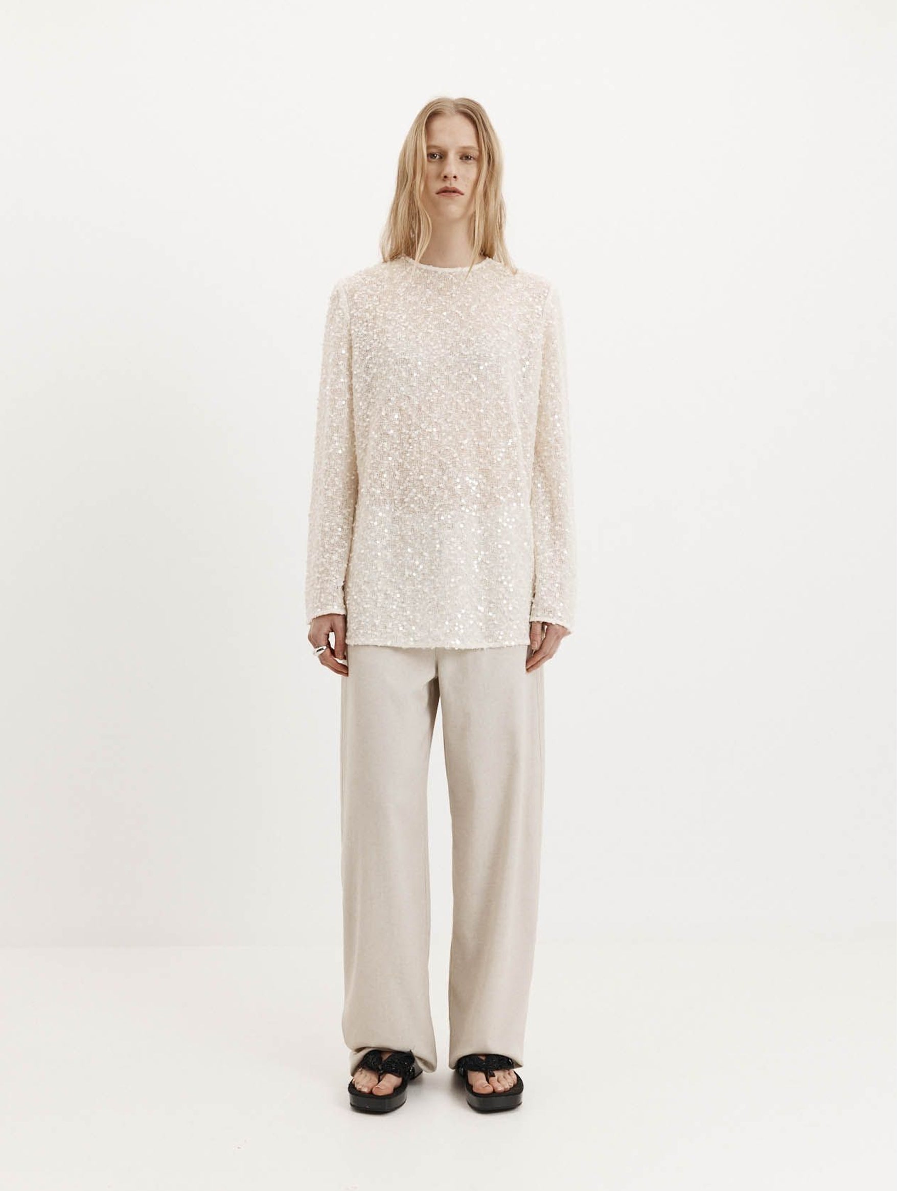 The Eva Top from Harris Tapper is the perfect balance of relaxed elegance and subtle glamour. Crafted in a cream sequinned knit, its long-sleeve silhouette drapes effortlessly, while a high neckline with a delicate button closure at the back adds a refined, polished touch. Sophisticated yet understated, it’s a versatile piece that brings quiet sparkle to both day and evening looks.