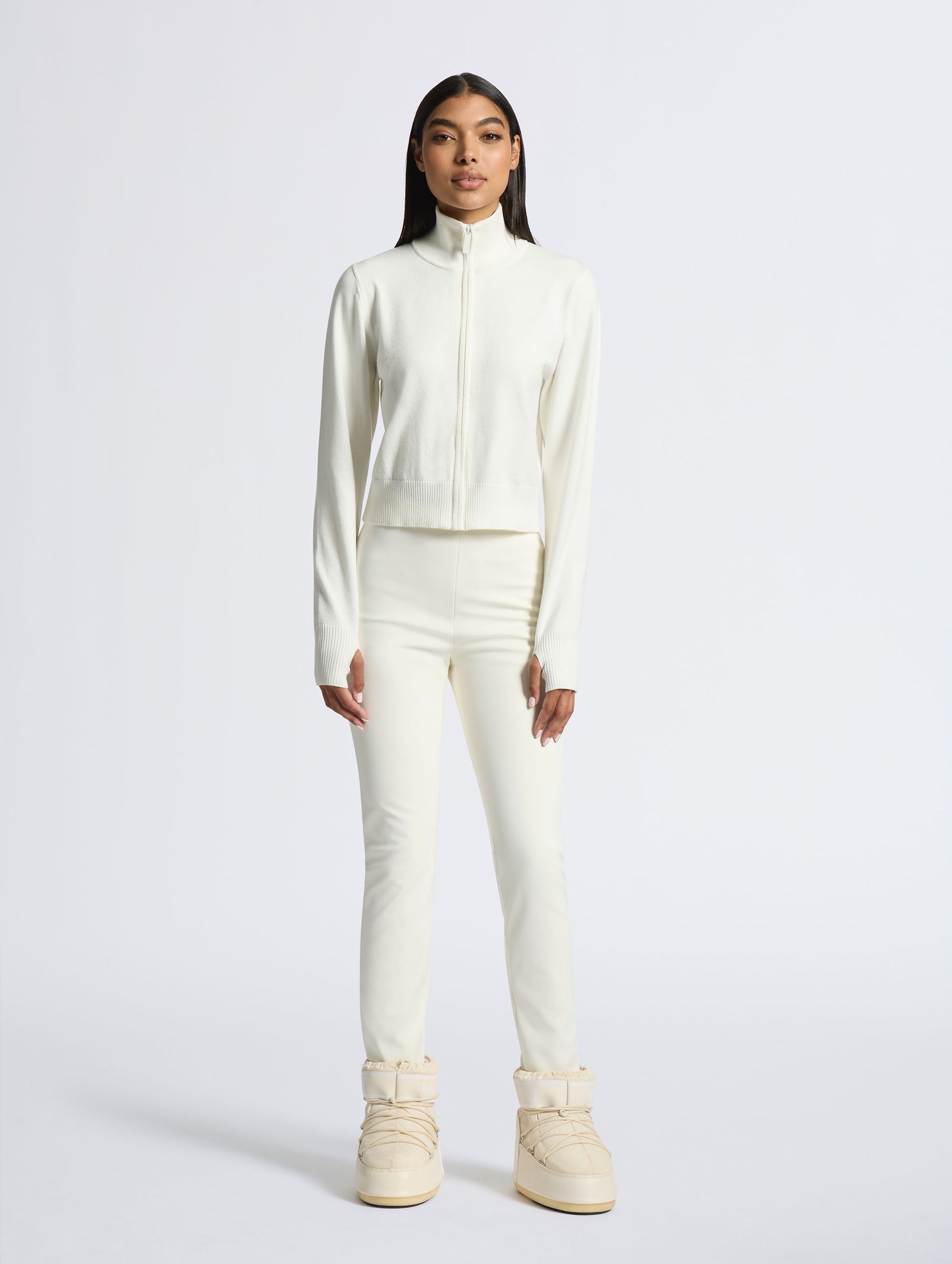 The Jessica Sweater in White from AMERL is where sleek design meets considered function. Crafted from breathable knit, it offers warmth without bulk, making it the perfect layering piece for ski days and beyond. A full-length zip lends versatility, while subtle thumbholes keep sleeves neatly in place and add a modern edge. Cut to flatter, this sweater moves effortlessly from the slopes to après-ski, embodying a balance of comfort, style, and understated sophistication.
