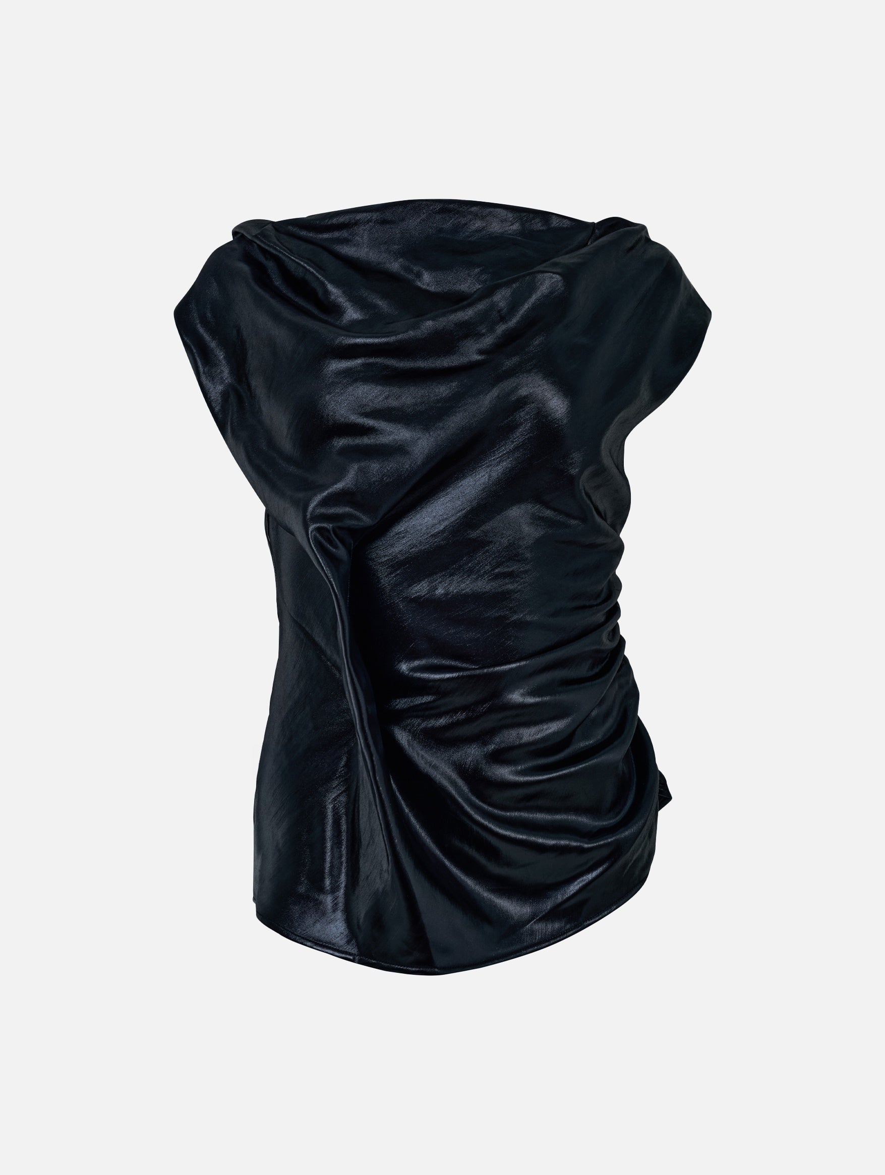 An evening essential, the Liquid Top in Black is made from Paris Georgia’s signature liquid-fabrication that offers a one-of-a-kind sheen and fluidity. With an asymmetrical silhouette that drapes off one shoulder, soft tucks and ruching throughout give it natural movement and sculpted elegance. The high-shine finish enhances the drape, making it feel like liquid on the skin. Pair it with the matching Remmy Skirt for a polished, head-to-toe look.