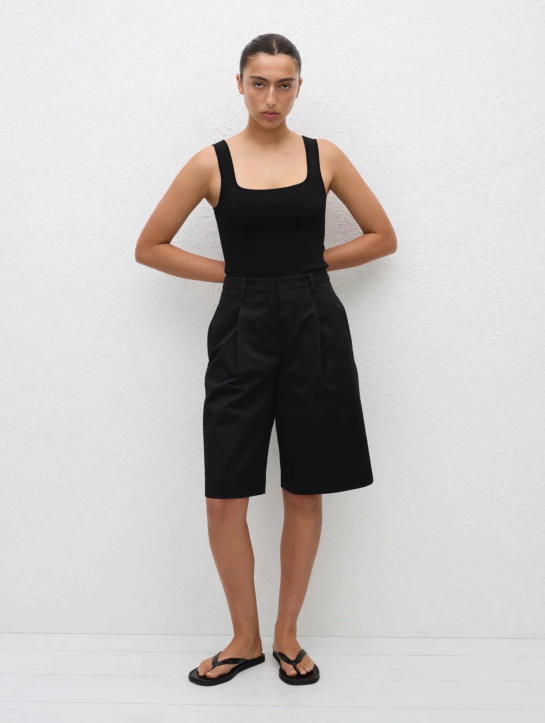 Channeling '90s minimalism, the Long Chino Short in Black by Matteau offers a contemporary twist on classic tailoring. Crafted from a structured organic cotton-twill blend, these shorts feature a single pleat and a wide, straight-leg silhouette that sits high on the waist. Designed with both side and back pockets, they combine functionality with refined elegance. Pair effortlessly with a baby tee and sandals for an elevated daytime look.