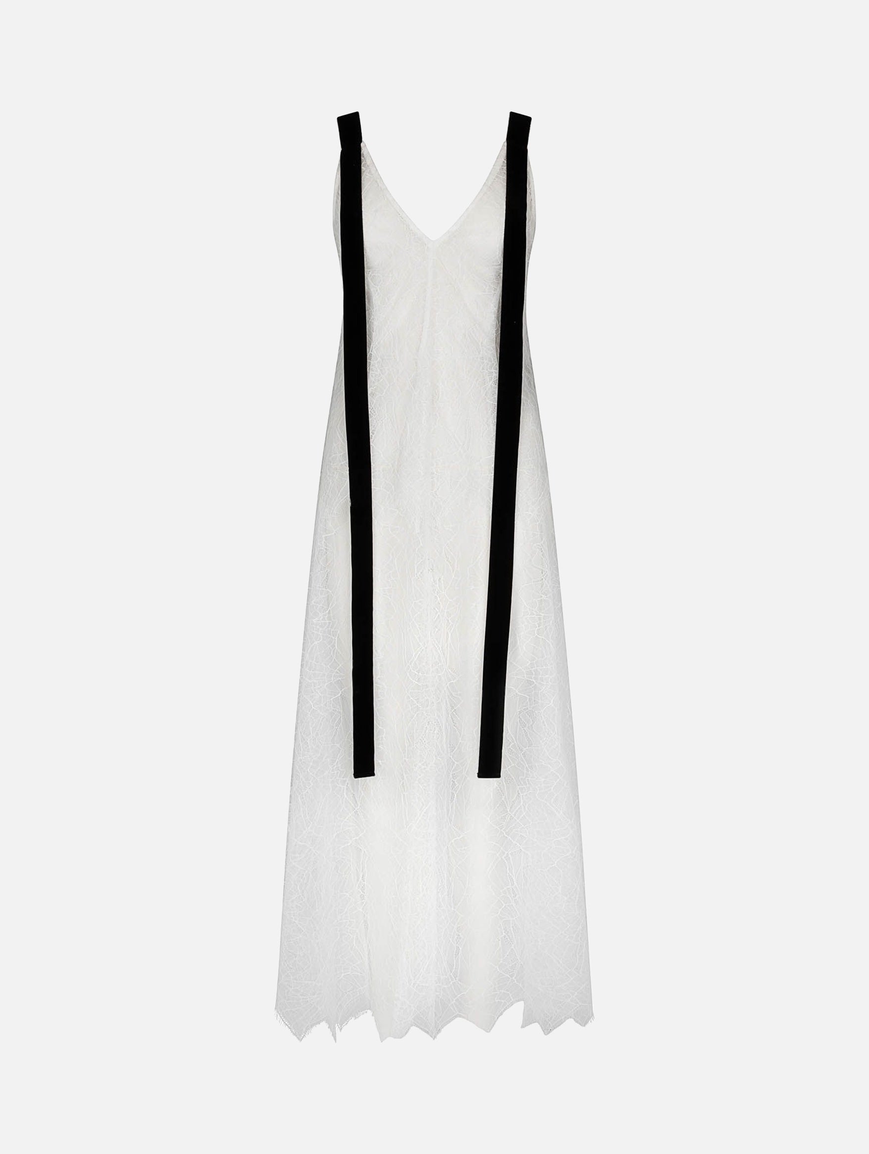 The Harris Tapper Lucinda Dress is a refined interplay of structure and softness, crafted in sheer white lace with a graceful V-neckline. A second layered bodice defines the waist before cascading over a calf-length skirt, while scalloped hems trace a delicate finish. Black velvet ribbon straps drape fluidly from each shoulder, adding a touch of drama to the ethereal silhouette. It’s an elegant balance of romance and modernity.