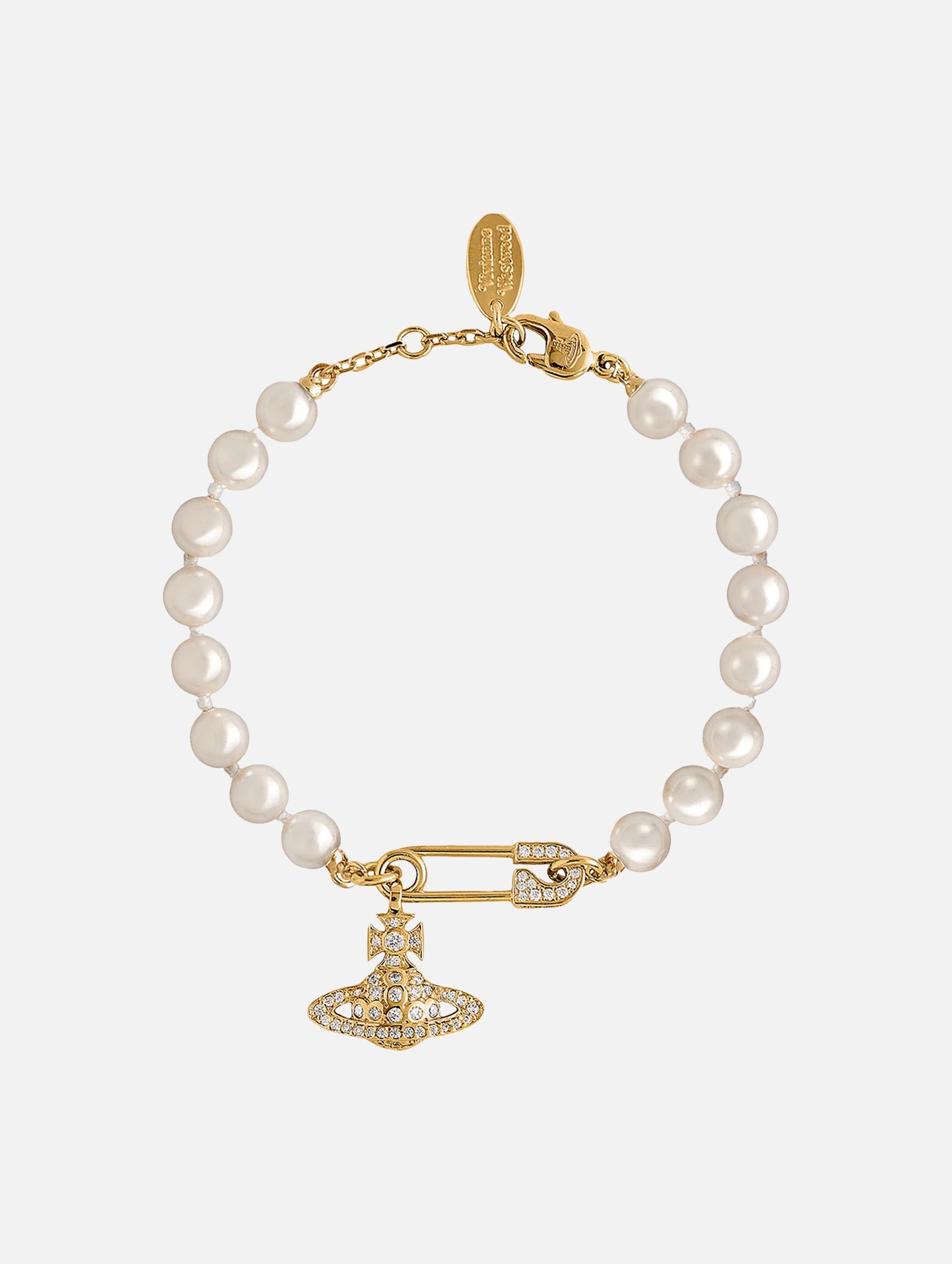 Pearls are a key element of the house’s iconography, representing both luxury and rebellion, and the Lucrece Pearl Bracelet in a Vivienne Westwood classic. Featuring a strand of glass-based pearls, accented by a crystal-encrusted orb that dangles from a safety pin charm. This timeless safety pin motif symbolises non-conformity, reflecting Vivienne’s signature punk-inspired approach.