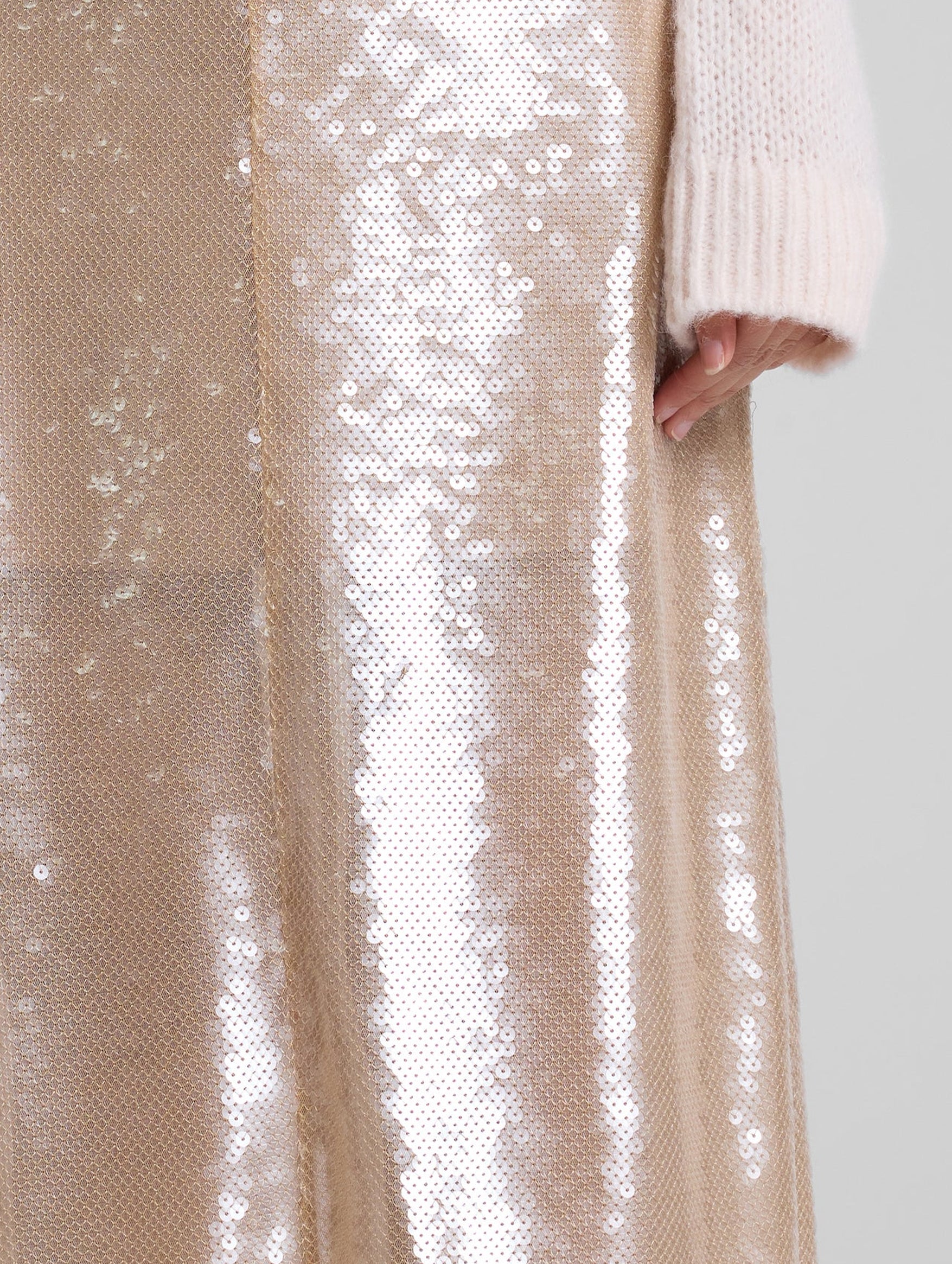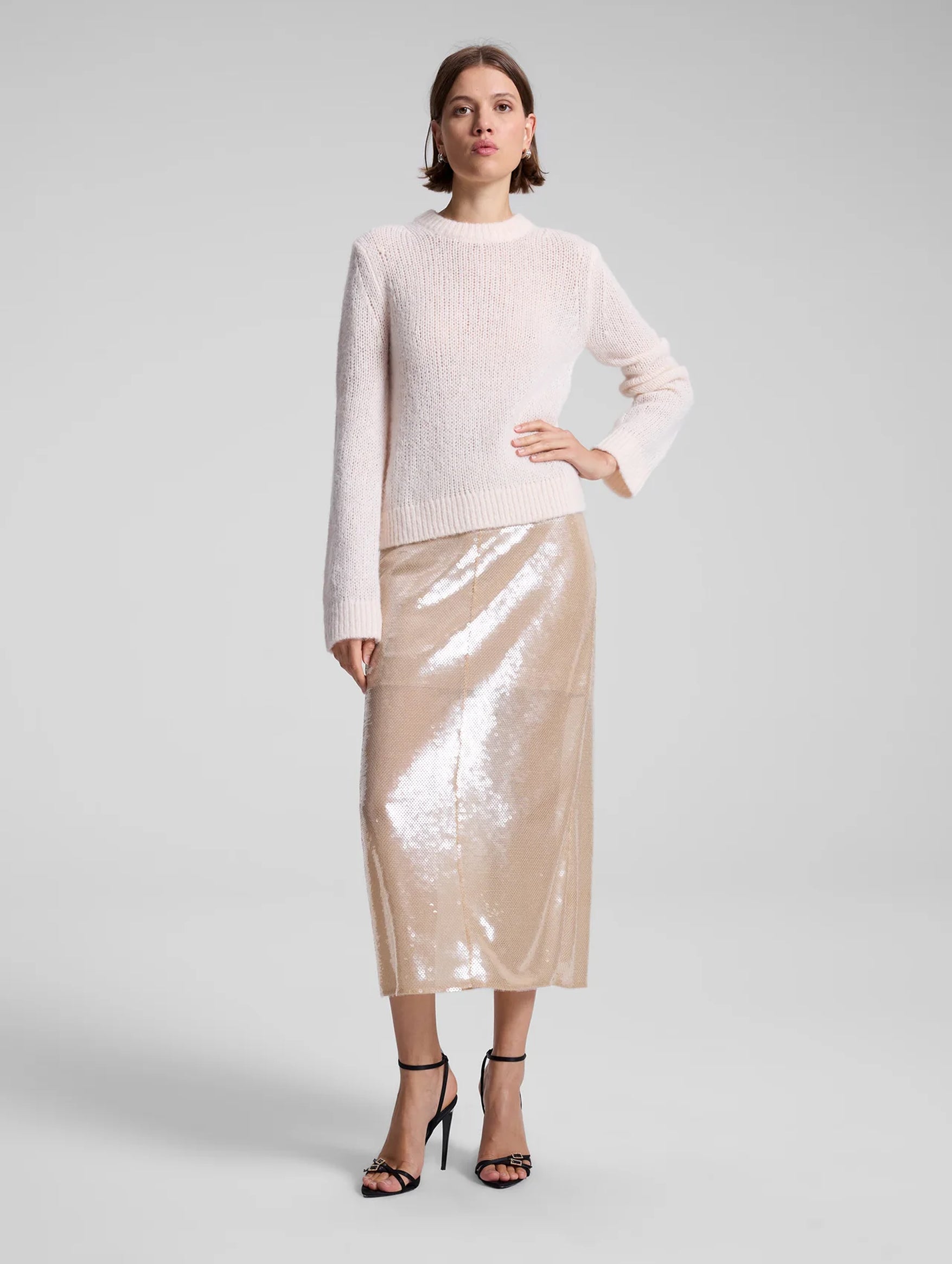 Meticulously crafted from soft sequins embroidered onto tulle in a taupe hue, the Monroe Soft Sequin Skirt from A.L.C offers a sophisticated interplay of texture and shimmer. Inspired by the minimalist aesthetic of the '90s, this midi silhouette is designed with a straight fit that subtly hugs the contours of the body, enhancing the figure with its understated shine and fluid movement. Pair with a simple cami and heels for an eye-catching look this season.
