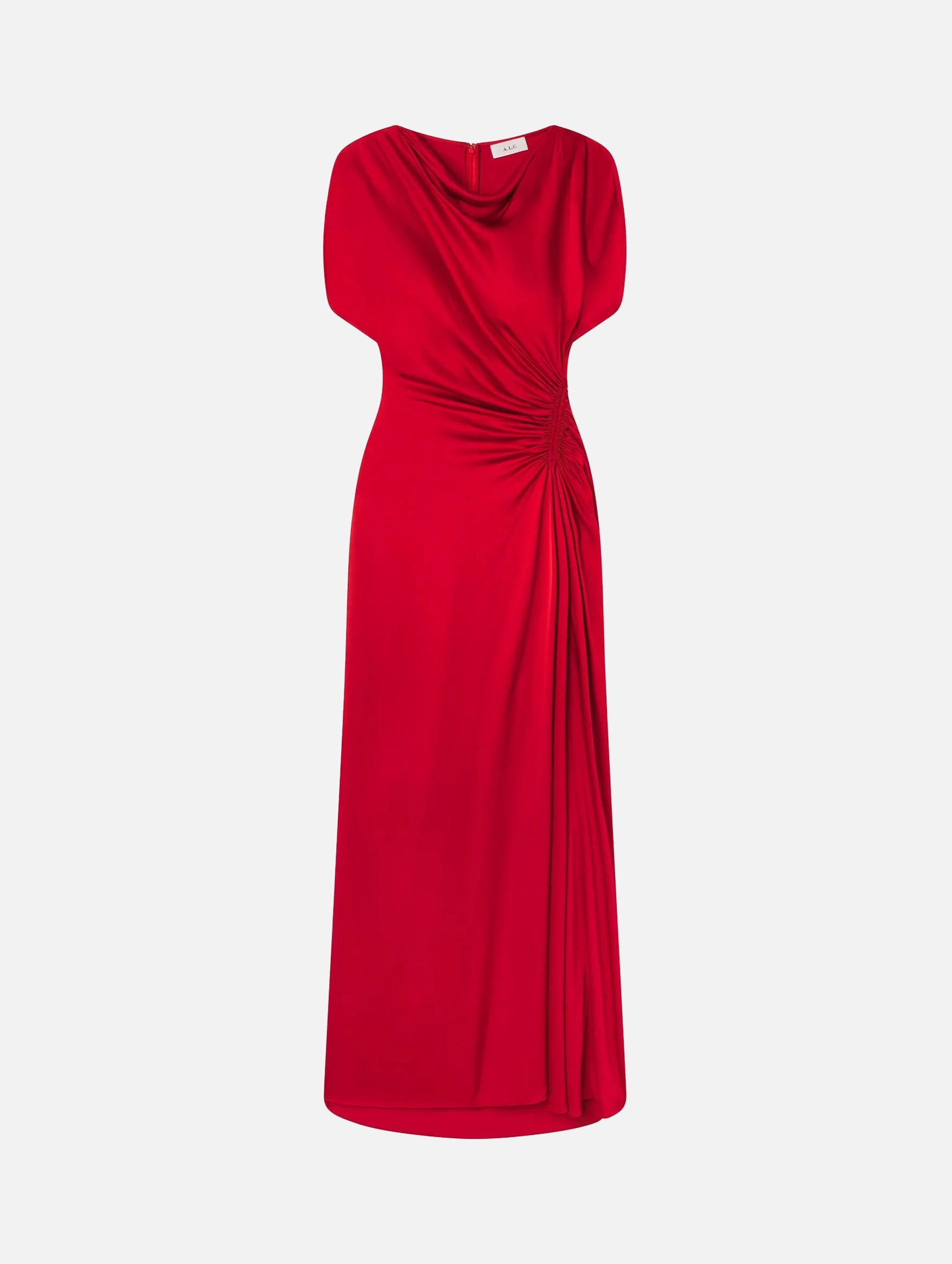 The Nadia Satin Gown from ALC is crafted from our fluid satin fabric in a vibrant red hue. This full-length silhouette features an elegantly draped cowl neckline and short sleeves with slits for added movement. Gathering along the curved seam through the hip creates another focal point, flowing into a draped hemline with beautiful movement. Pair with metallic heels and statement earrings for a sleek holiday look.