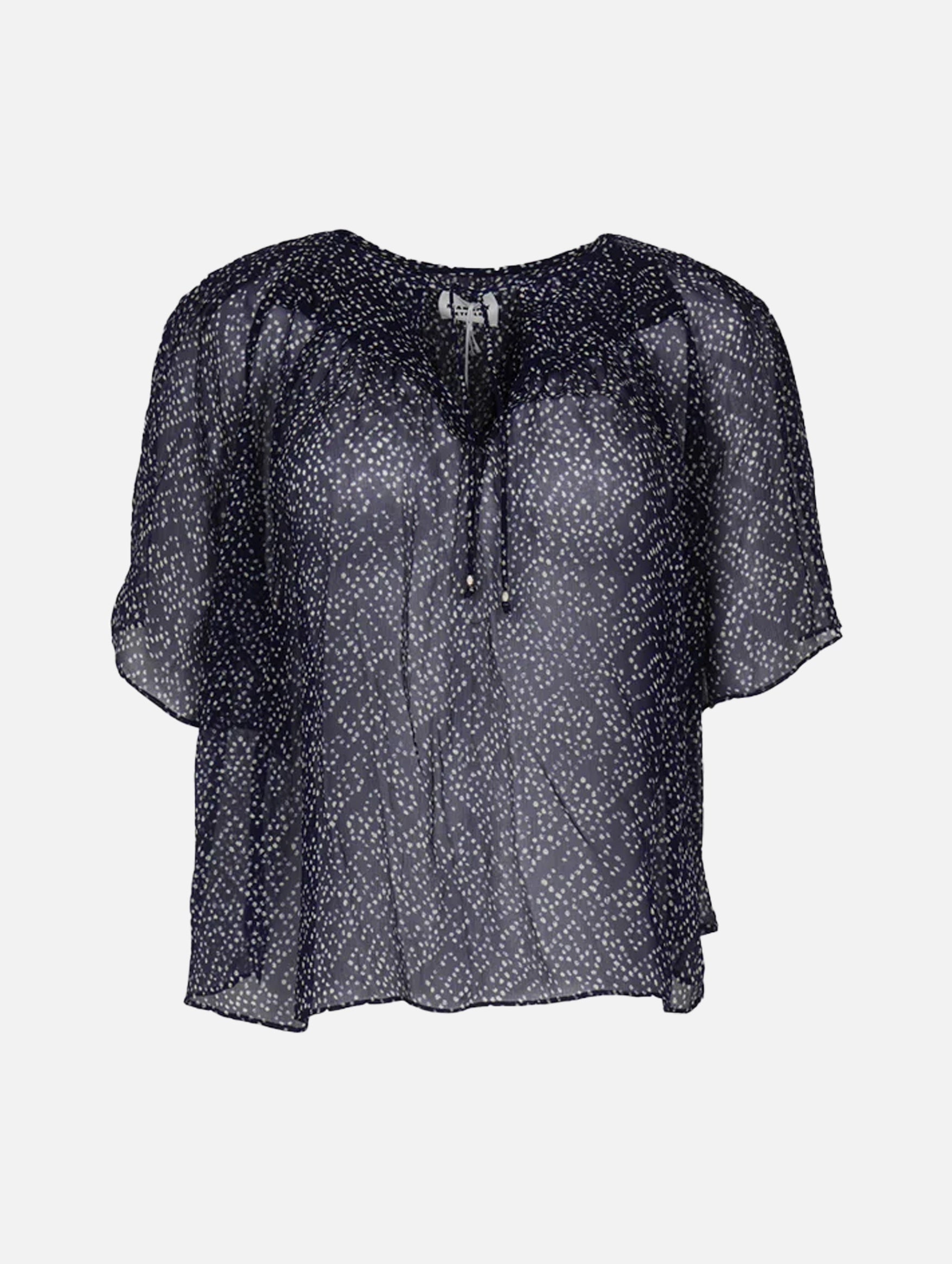 The Neslya Top in Midnight by Isabel Marant captures effortless elegance with its printed muslin construction and thoughtfully curated design details. A distinctive Tunisian neckline adorned with delicate string ties and metal beads creates an eye-catching focal point, while short, lightweight sleeves offer breathable comfort. Pleated detailing at the bodice adds dimension and movement, complemented by a flared silhouette that drapes beautifully.