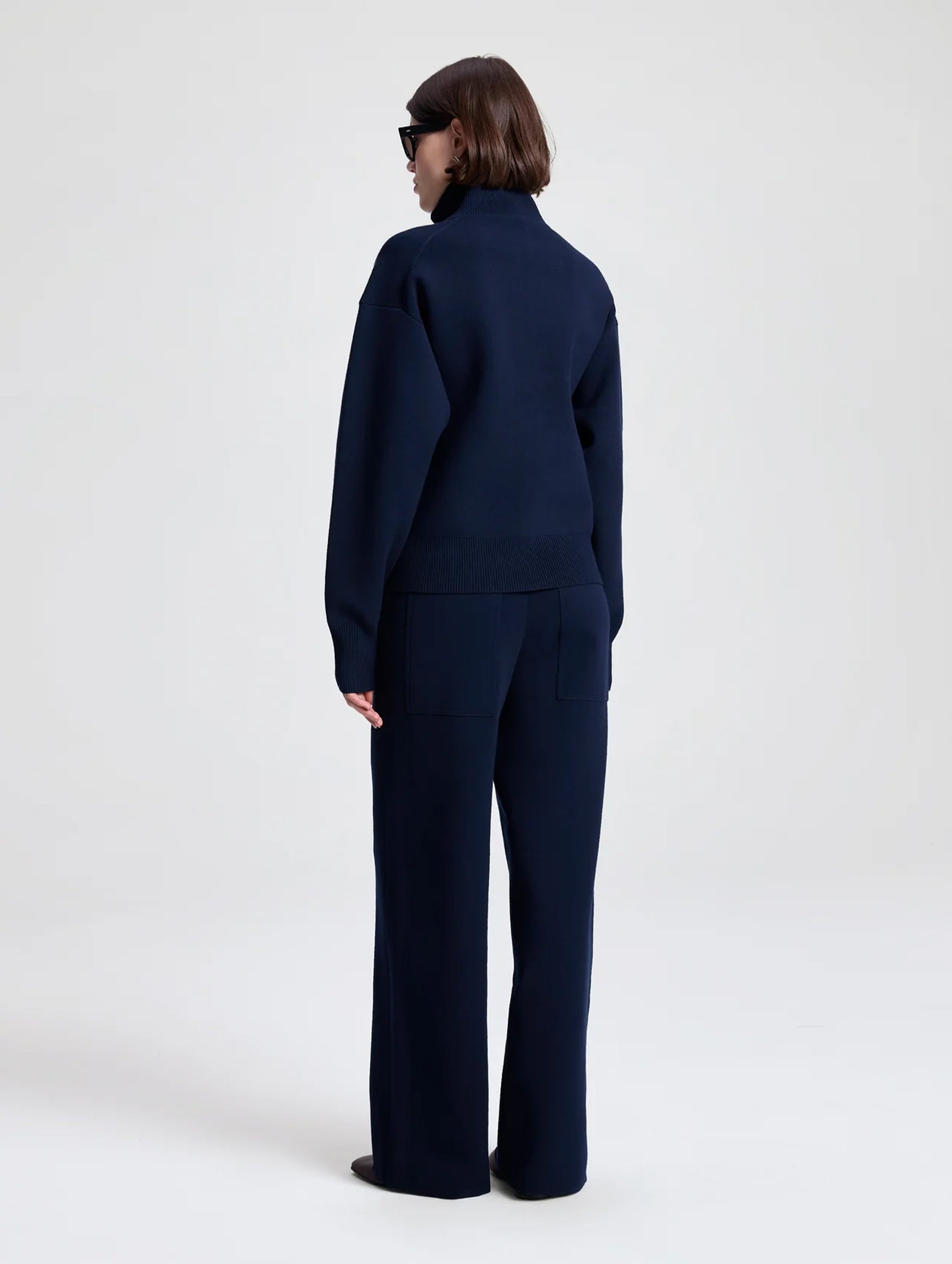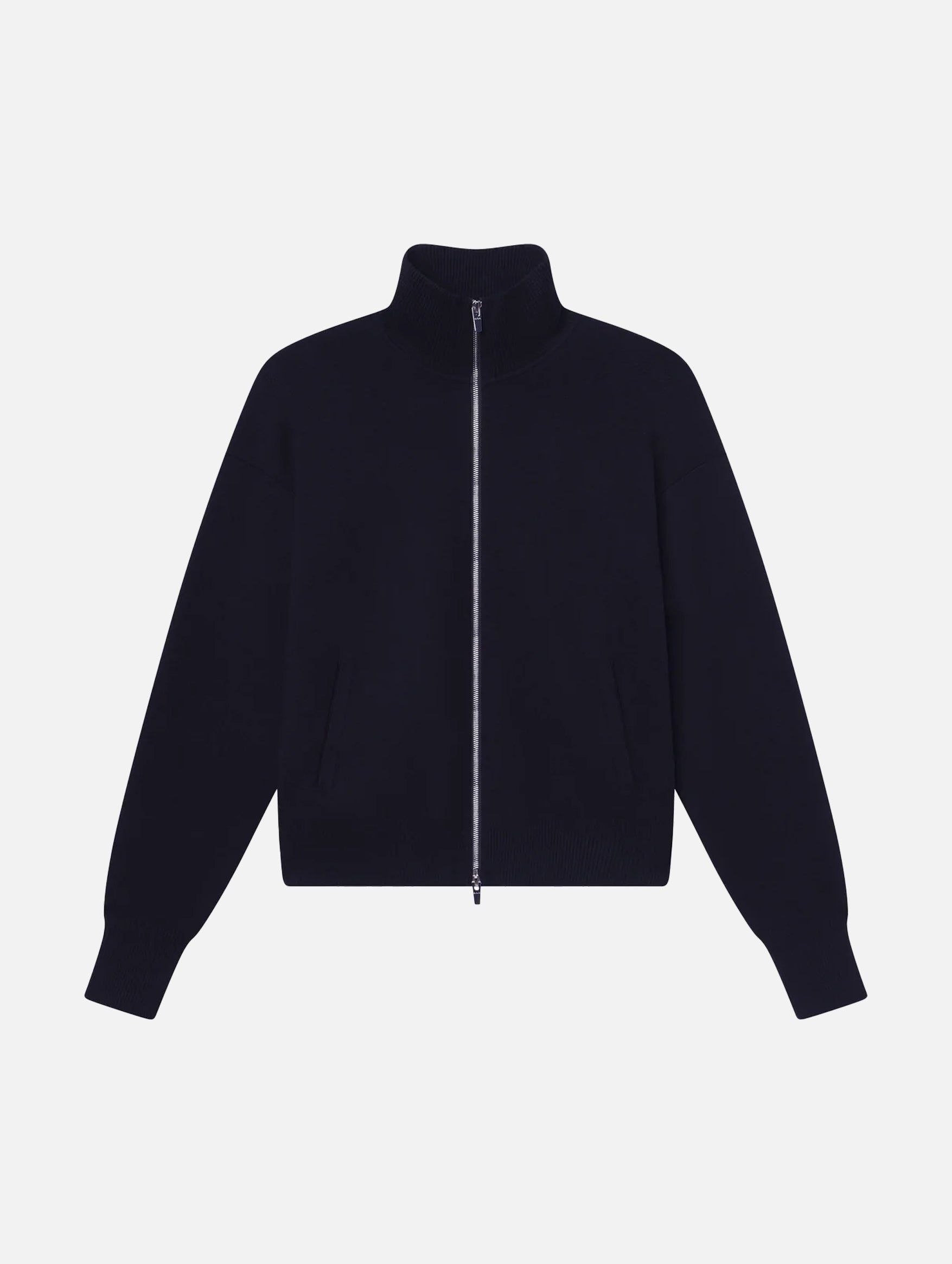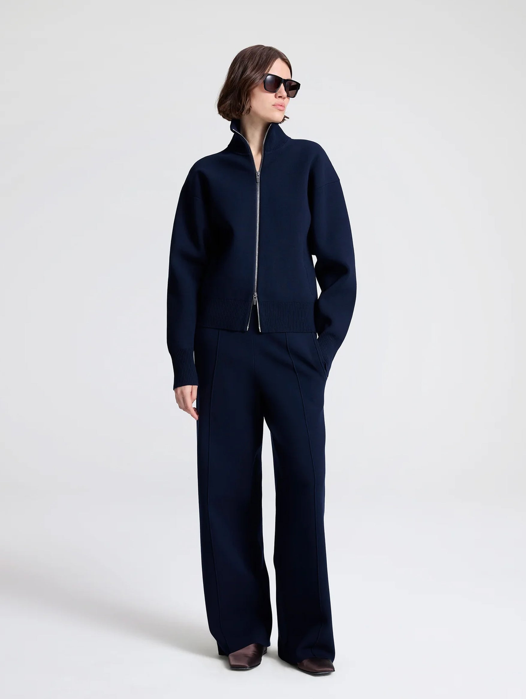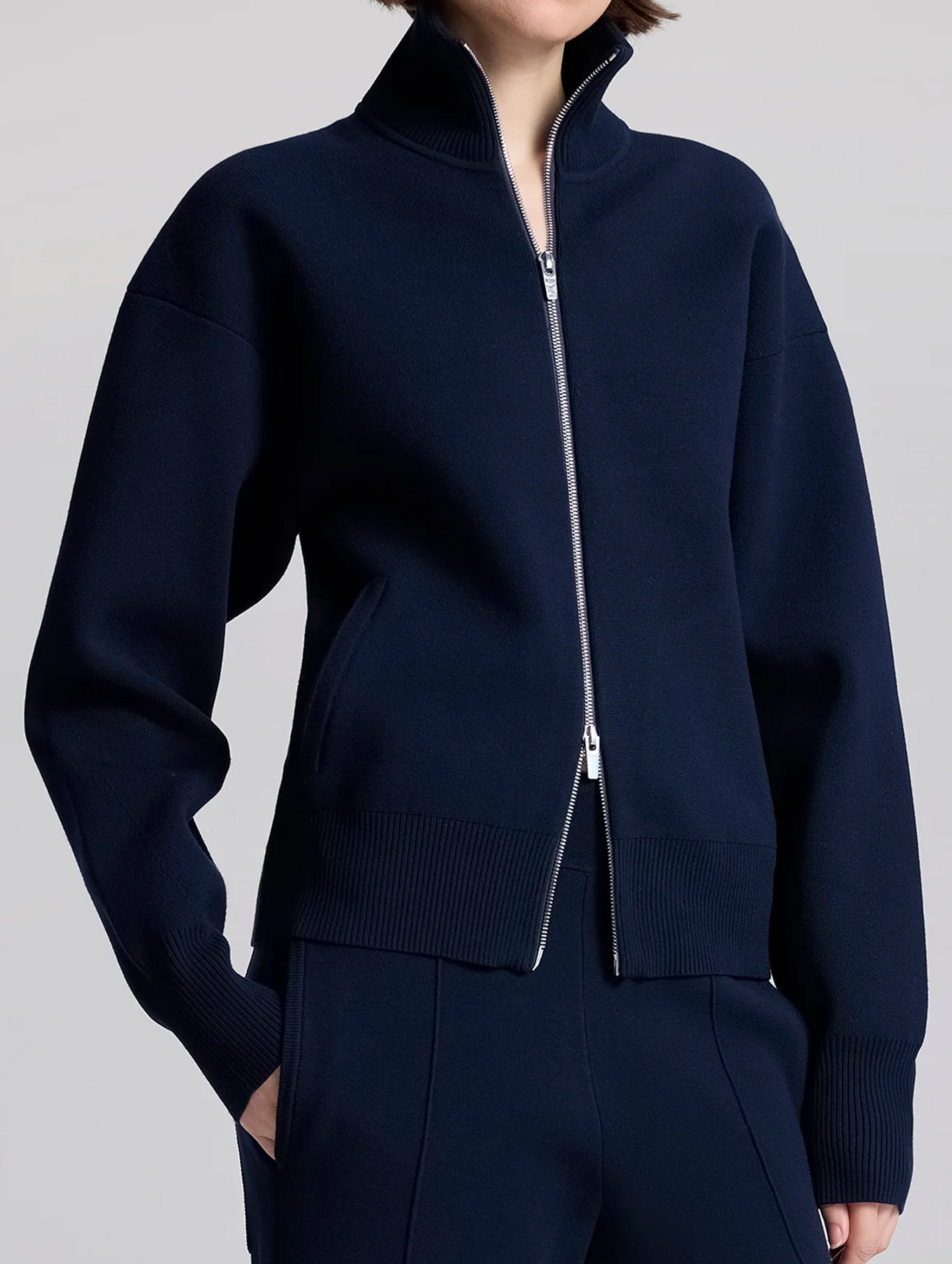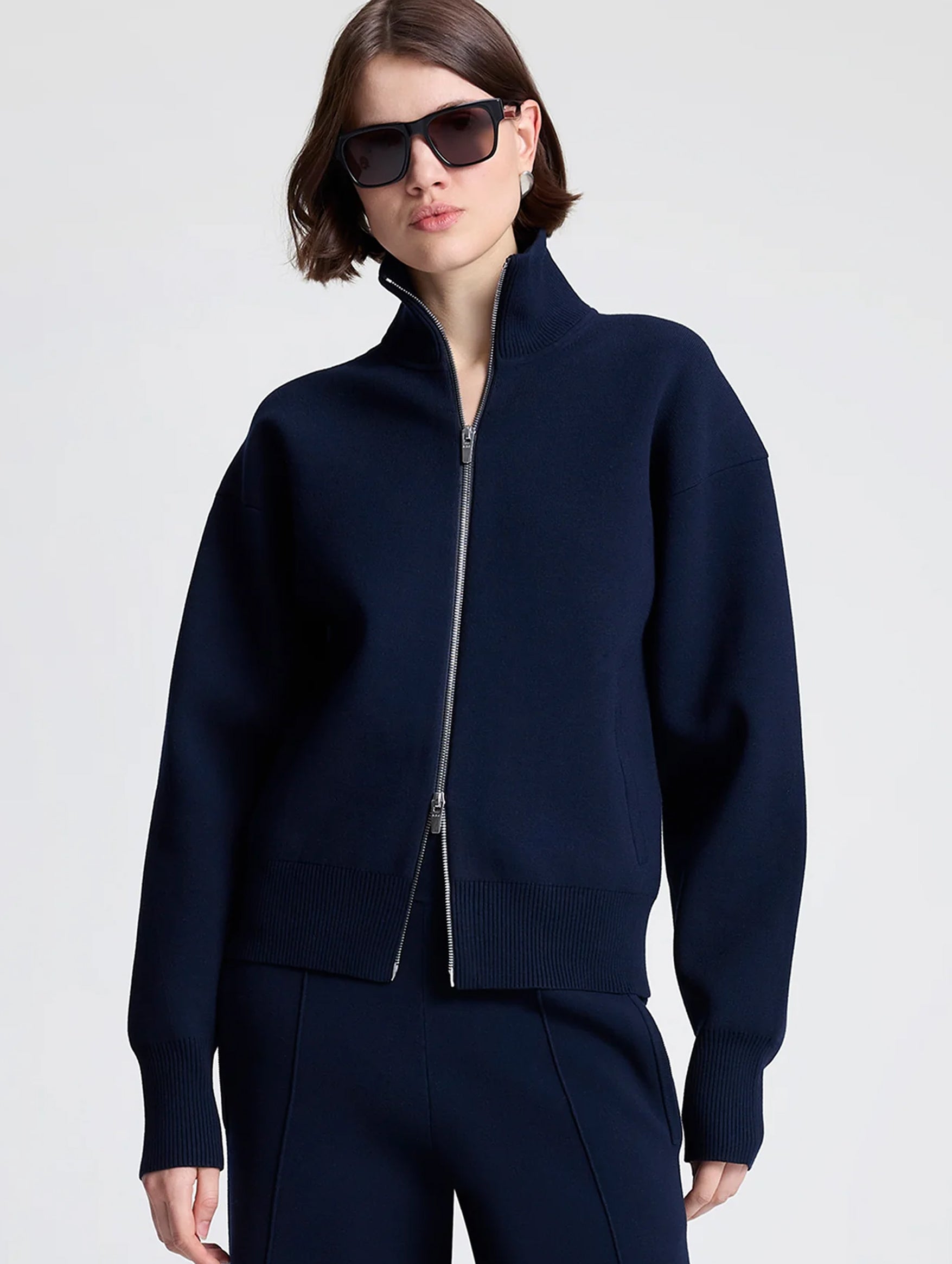 A.L.C's Oliver Knit Zip Cardigan in Navy offers a modern take on elevated layering. Crafted from a structured viscose blend, its sculptural silhouette is defined by a tailored stand collar, dropped shoulders, and a two-way zip that effortlessly balances form and function. Hip-length and intentionally proportioned, it pairs seamlessly with matching Corey Pants for curated ease, or refines a casual outfit with its subtle architectural edge.!