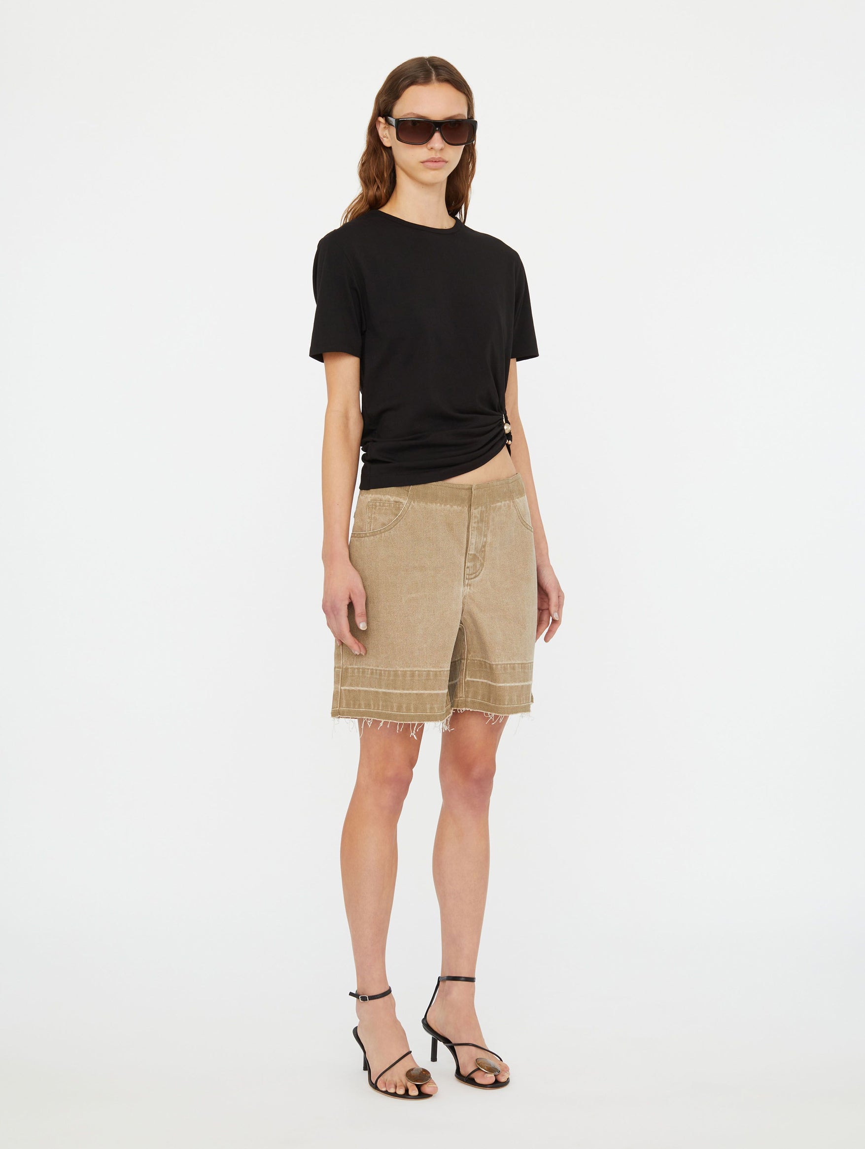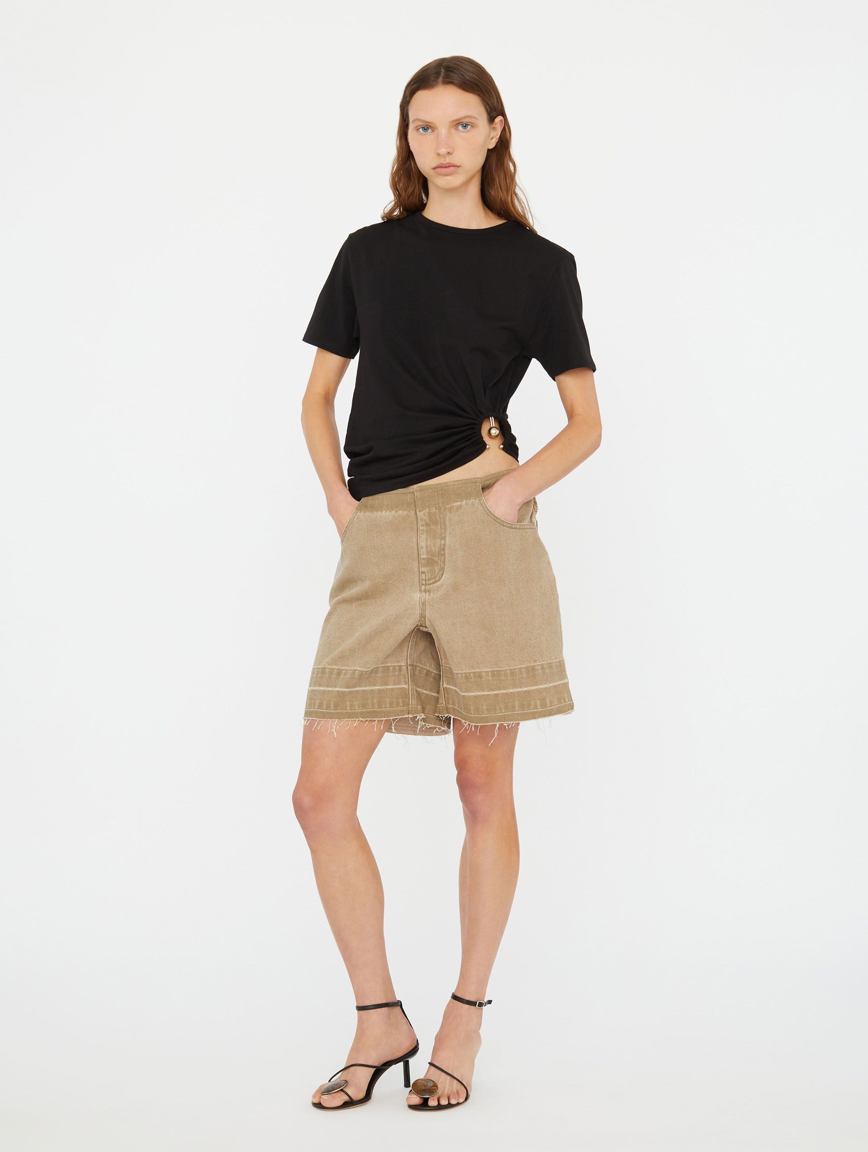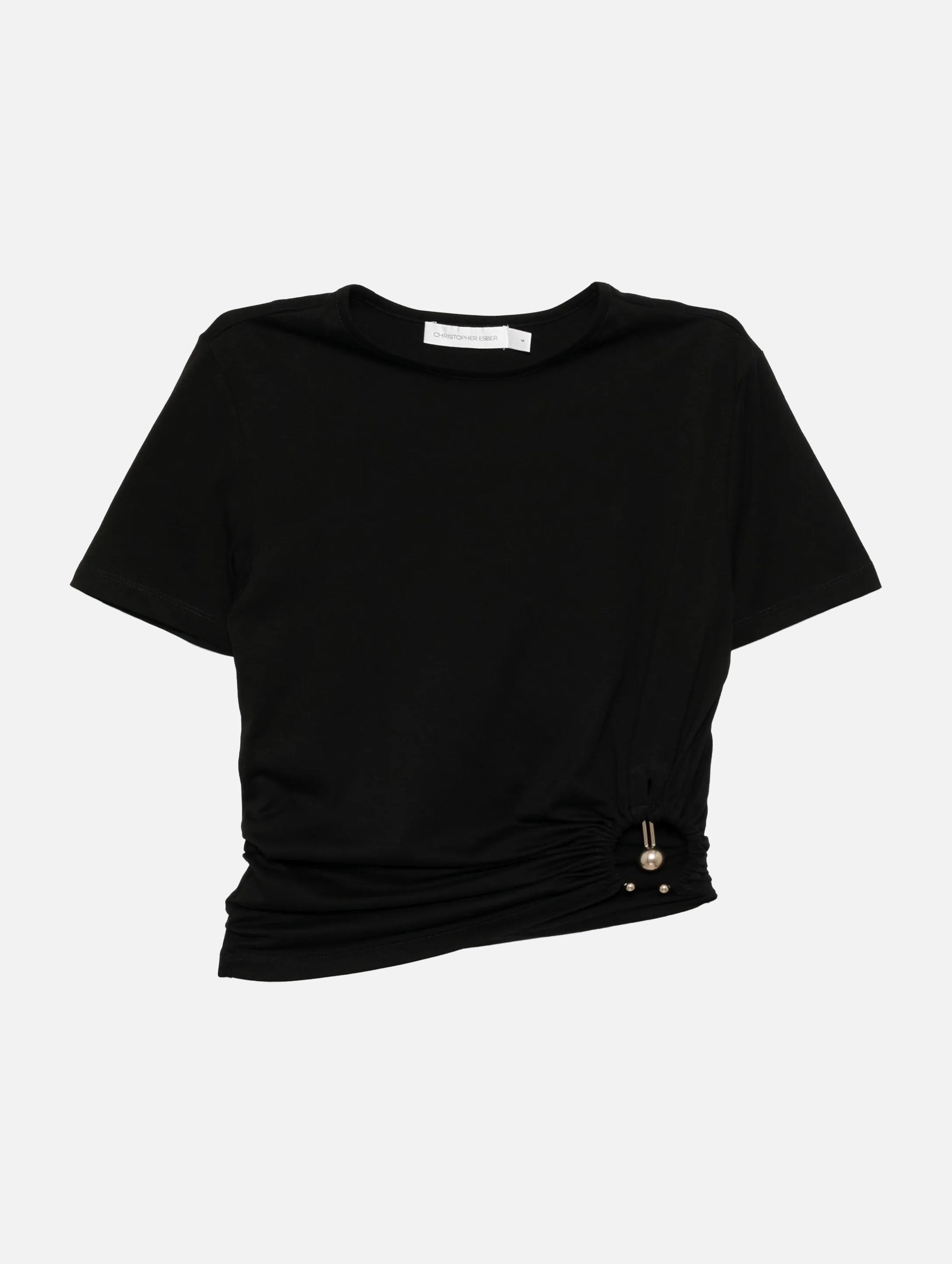 An interplay between soft and sculptural, the Orbit Tee from Christopher Esber is an elevated rendition of an everyday style. This classic silhouette reveals contorted detailing with its metal hardware at the hip, ruching the fabric for a truely unique silhouette. The perfect elevation for your everyday closet.
