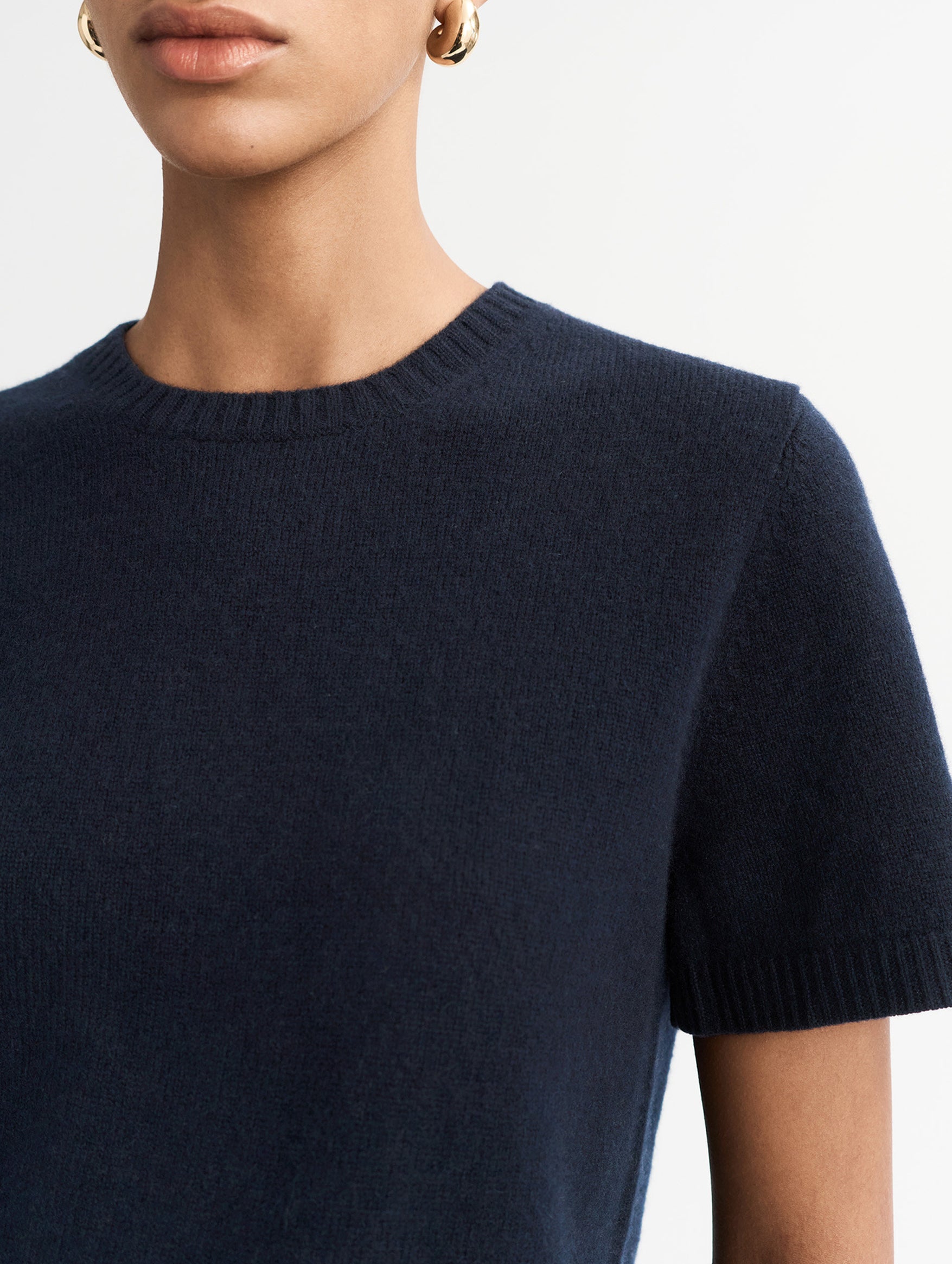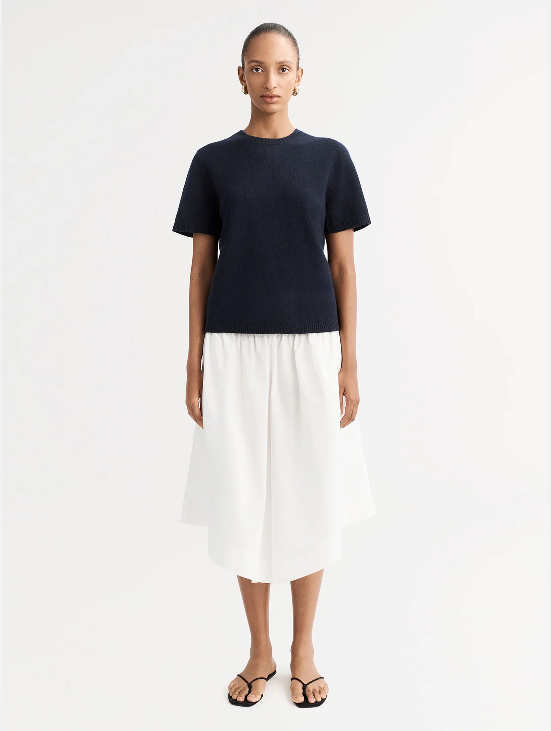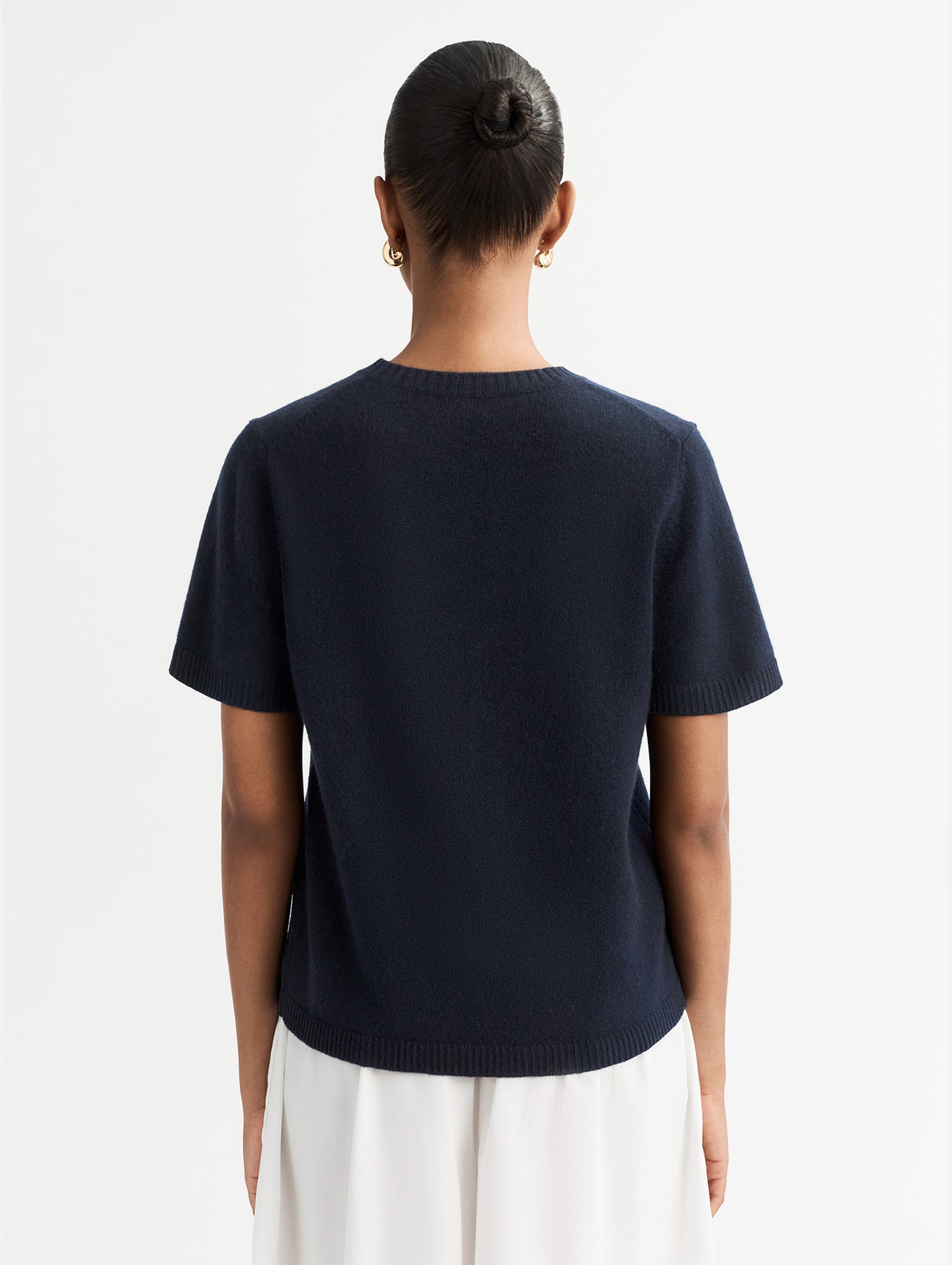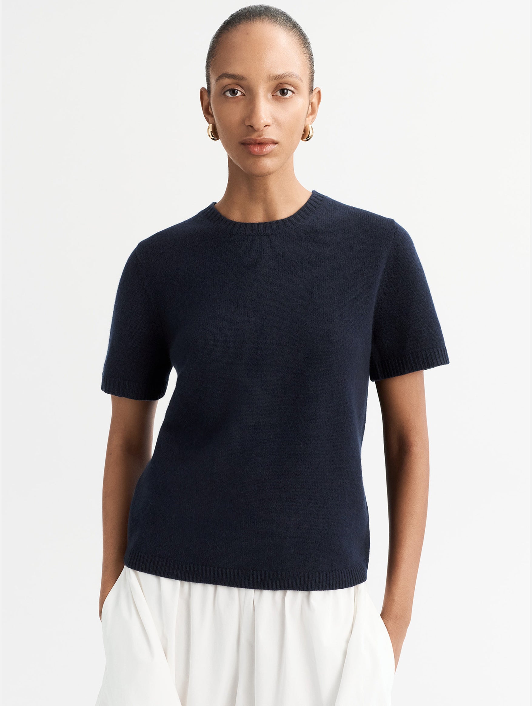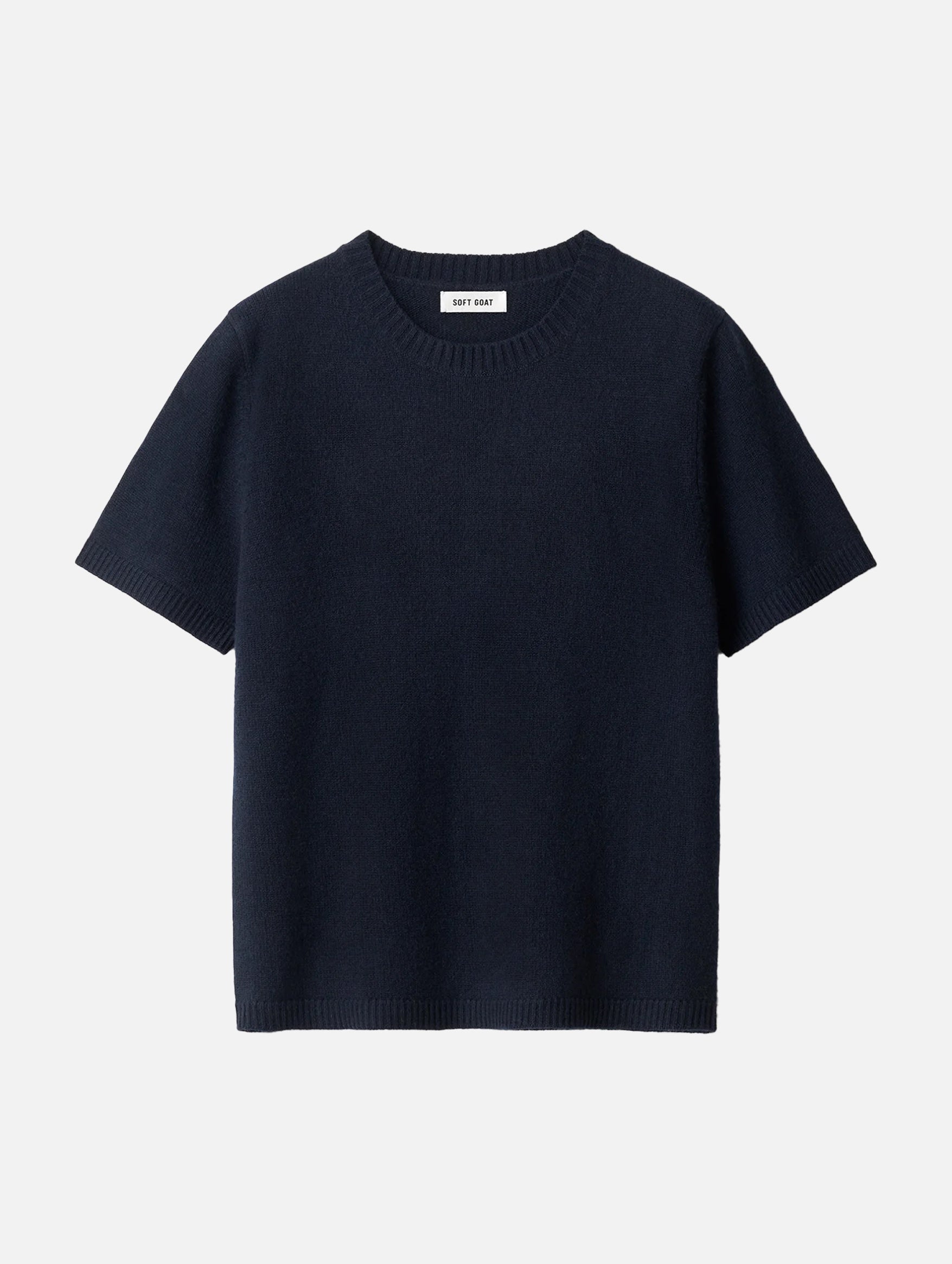 The Oversized Cashmere T-Shirt in Navy is Soft Goat's take on a classic style. Knitted from a fine cashmere, the silhouette has a relaxed, slouchy fit with ribbed hems and a short sleeves. Wear yours tucked into straight leg denim on the weekend or dress up with a leather trouser for your weekend getaways.