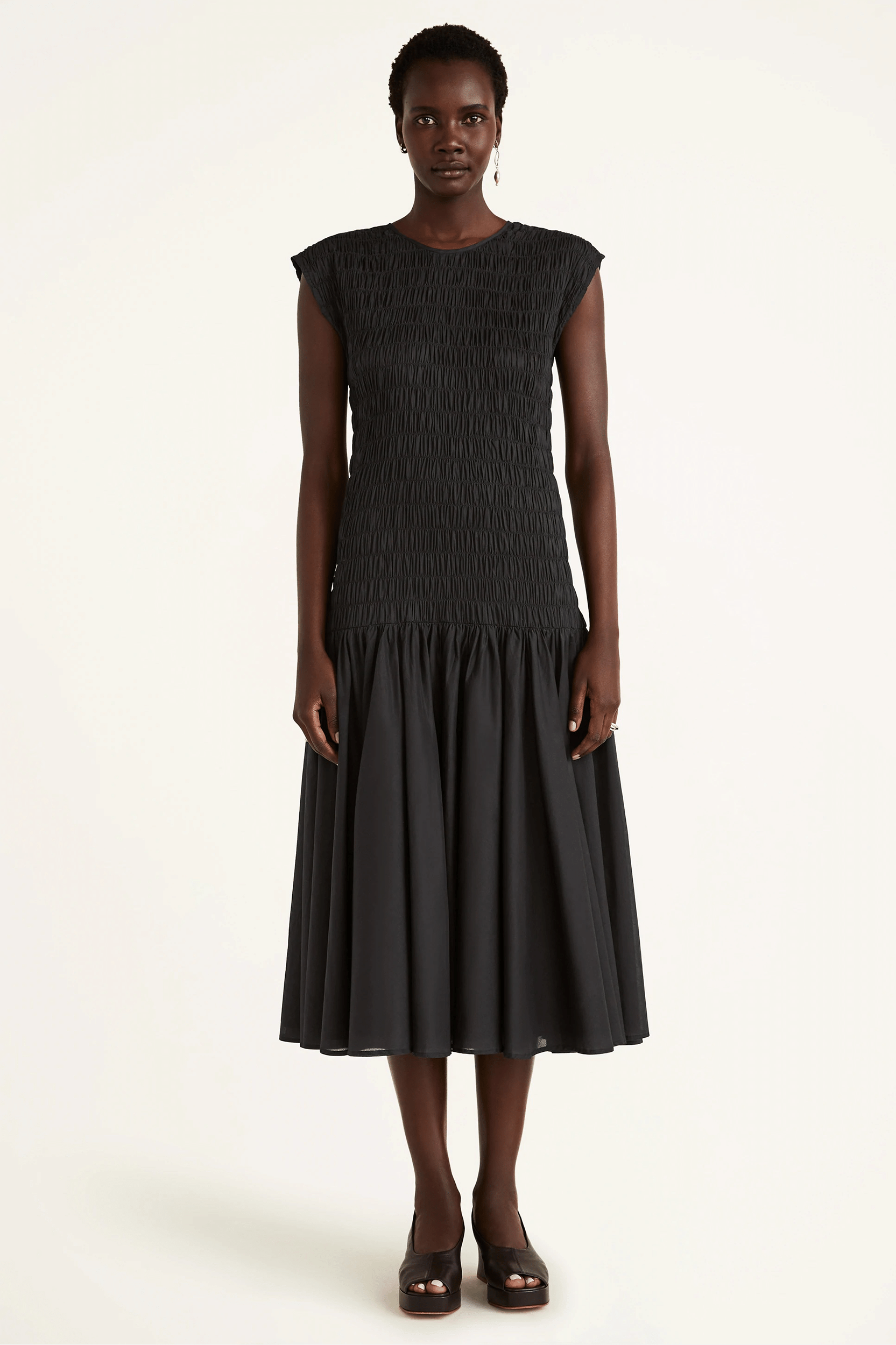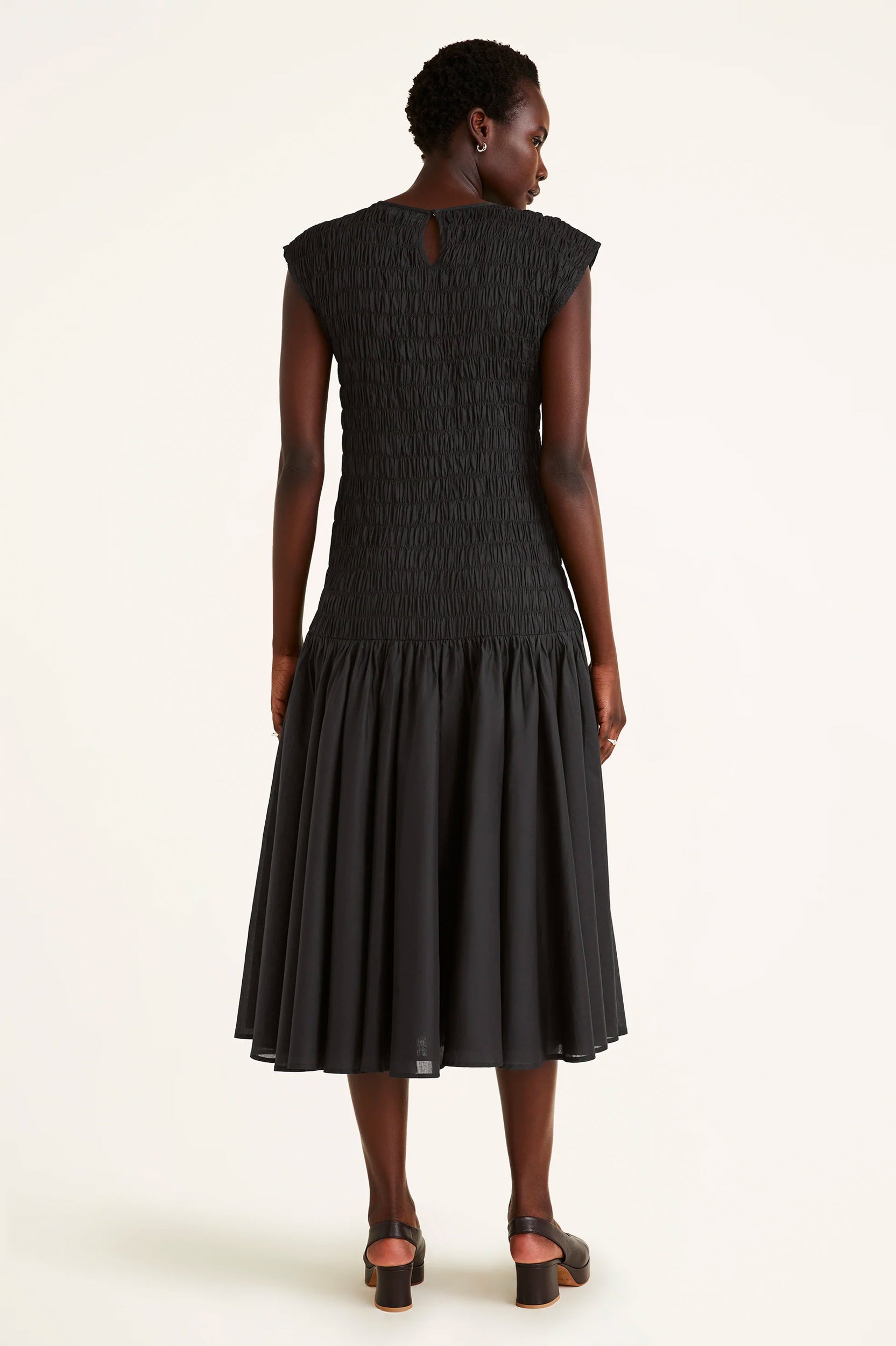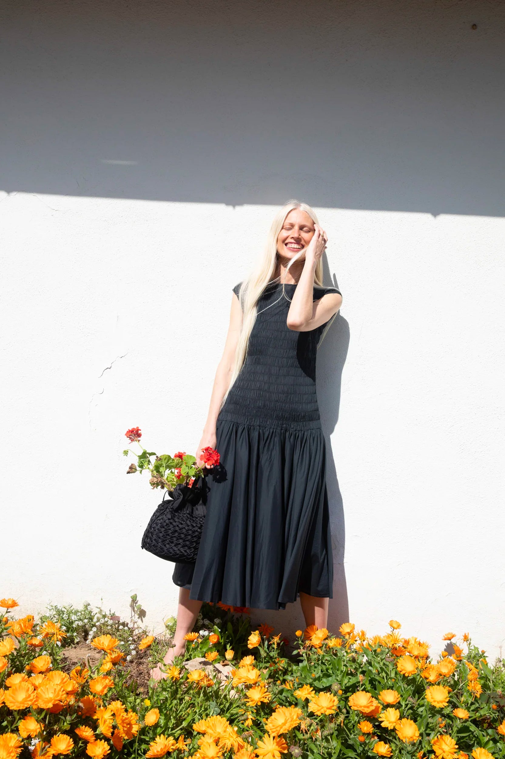 All-over smocking creates a silhouette that skims, but doesn’t hug, the body to the hips. The drop waist flares into a fluttering skirt that hits at mid-calf for a flattering midi length. The smocking uses a soft elastic thread that ensures a comfortable wear and a versatile fit. The cap sleeve gives a touch of extra coverage and elegance, making this one of our favorite dresses for weddings and other events.