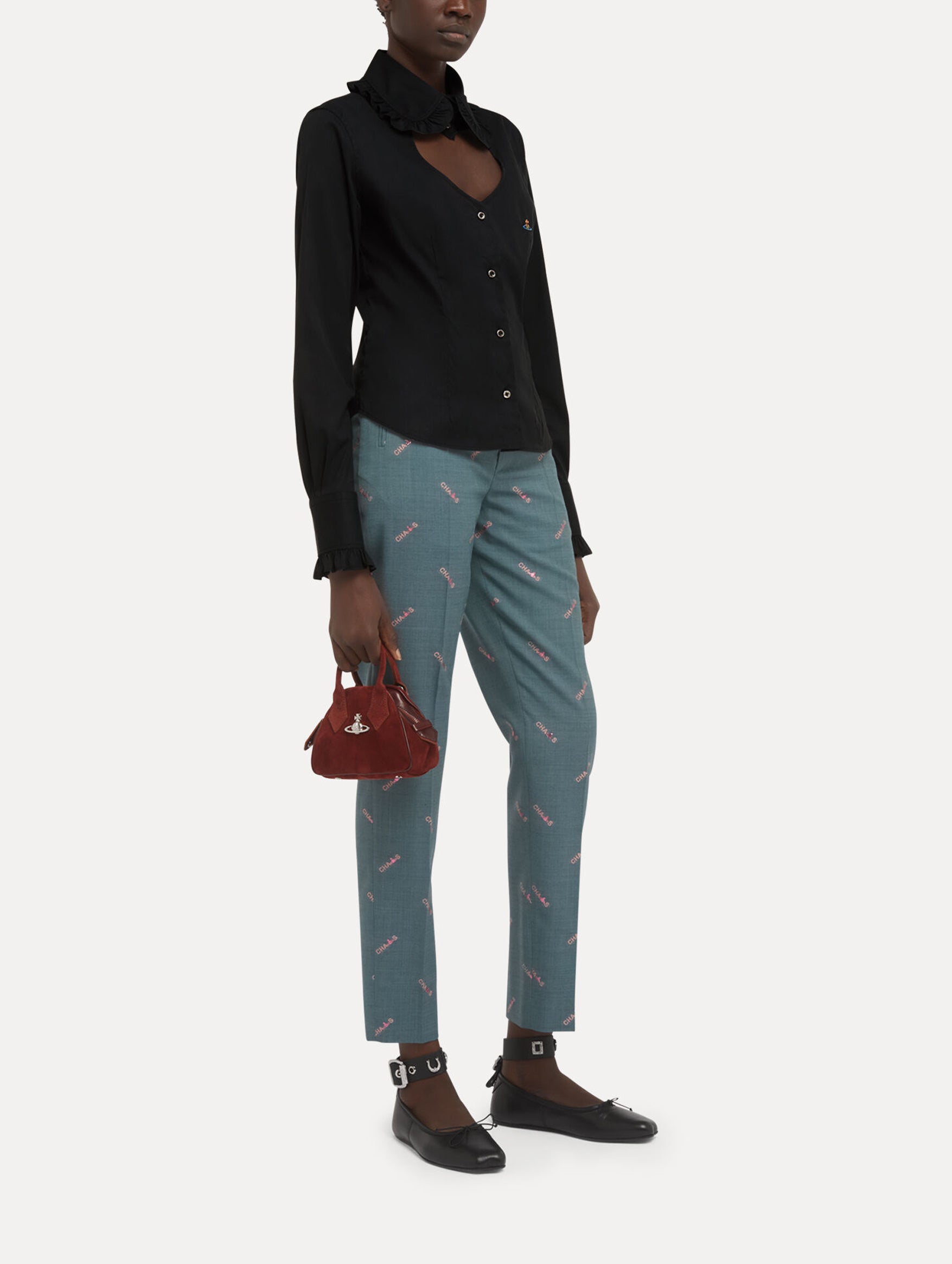 The Vivienne Westwood Toulouse Cotton Frill Shirt in Black is a romantic reinterpretation of a classic silhouette. Crafted from crisp organic cotton, it features a sculpted fit that flatters the form, complete with delicate frill detailing along the collar and cuffs. The curved hem and precise darting create subtle structure, while the embroidered Orb motif adds a quiet note of rebellion. A timeless piece that balances Victorian femininity with Westwood’s signature edge.
