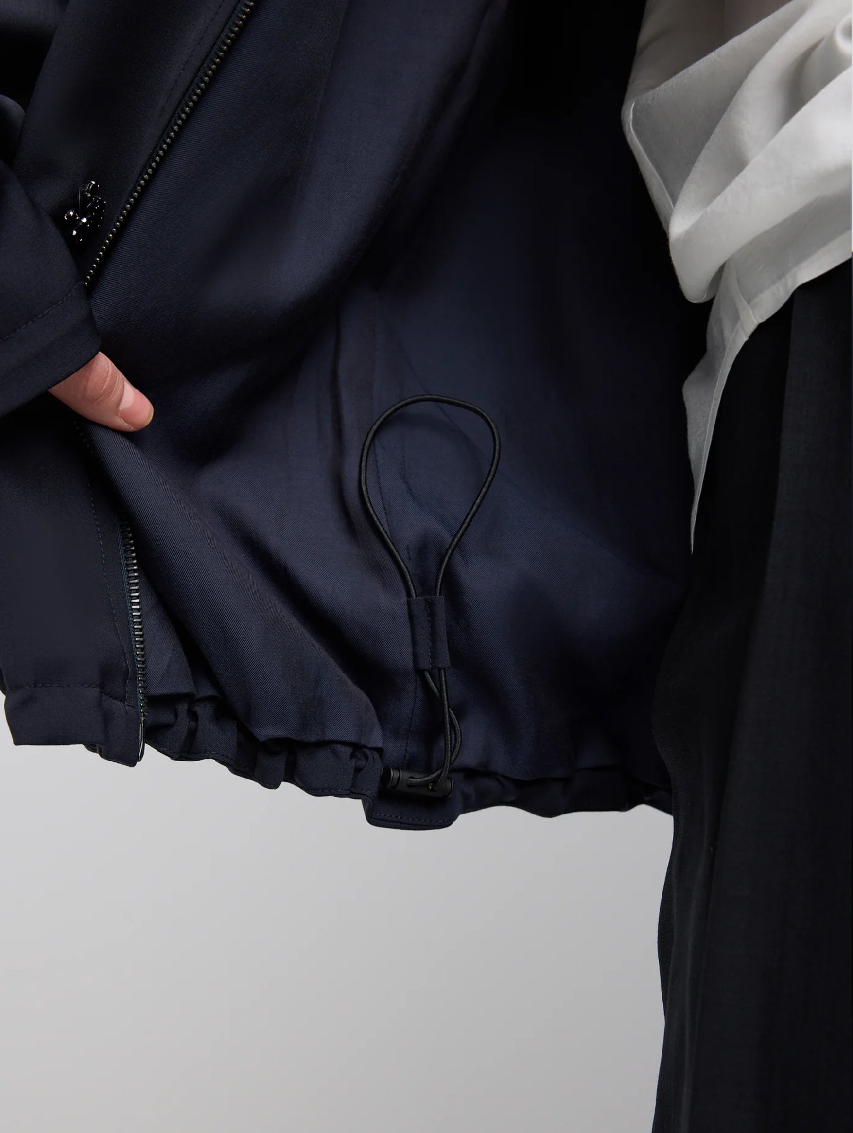 The Tibi Tropical Wool Beaded Bomber in Navy reimagines the bomber with a luxe twist, think sporty silhouette meets subtle sparkle. Crafted from a tropical wool blend and fully adorned with delicate beading, it features a sleek V‑neckline, adjustable waistband, dual‑way zip, and pockets for both polish and practicality. It’s the kind of jacket that effortlessly elevates denim or tailoring.