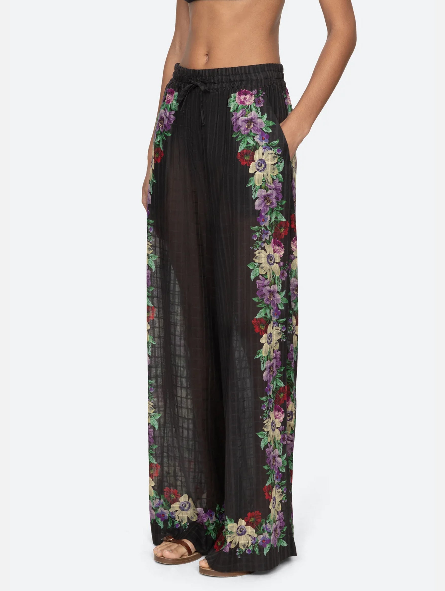 The Sea New York Viktoria Pants are a soft and elegant tribute to summer ease. Crafted in lightweight voile with a fluid floral print, they feature a relaxed wide-leg fit and an elasticised drawstring waist for both comfort and silhouette. The breathable fabric lends a gentle drape, making these pants a dreamy choice for resort days or warm city strolls. Pair with the coordinating Viktoria Print One Piece for poolside elegance.