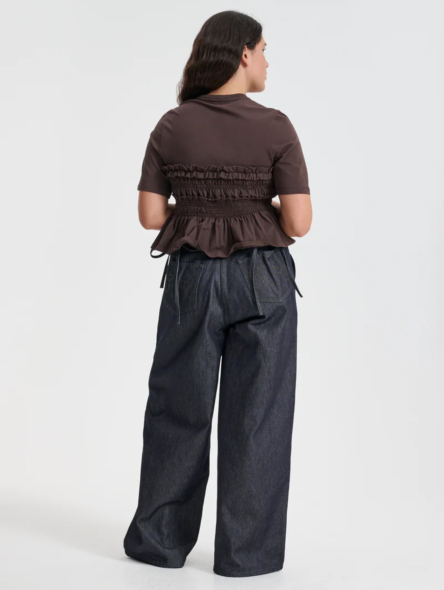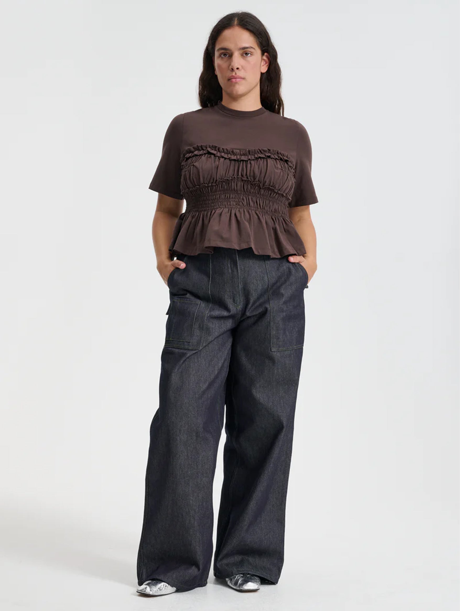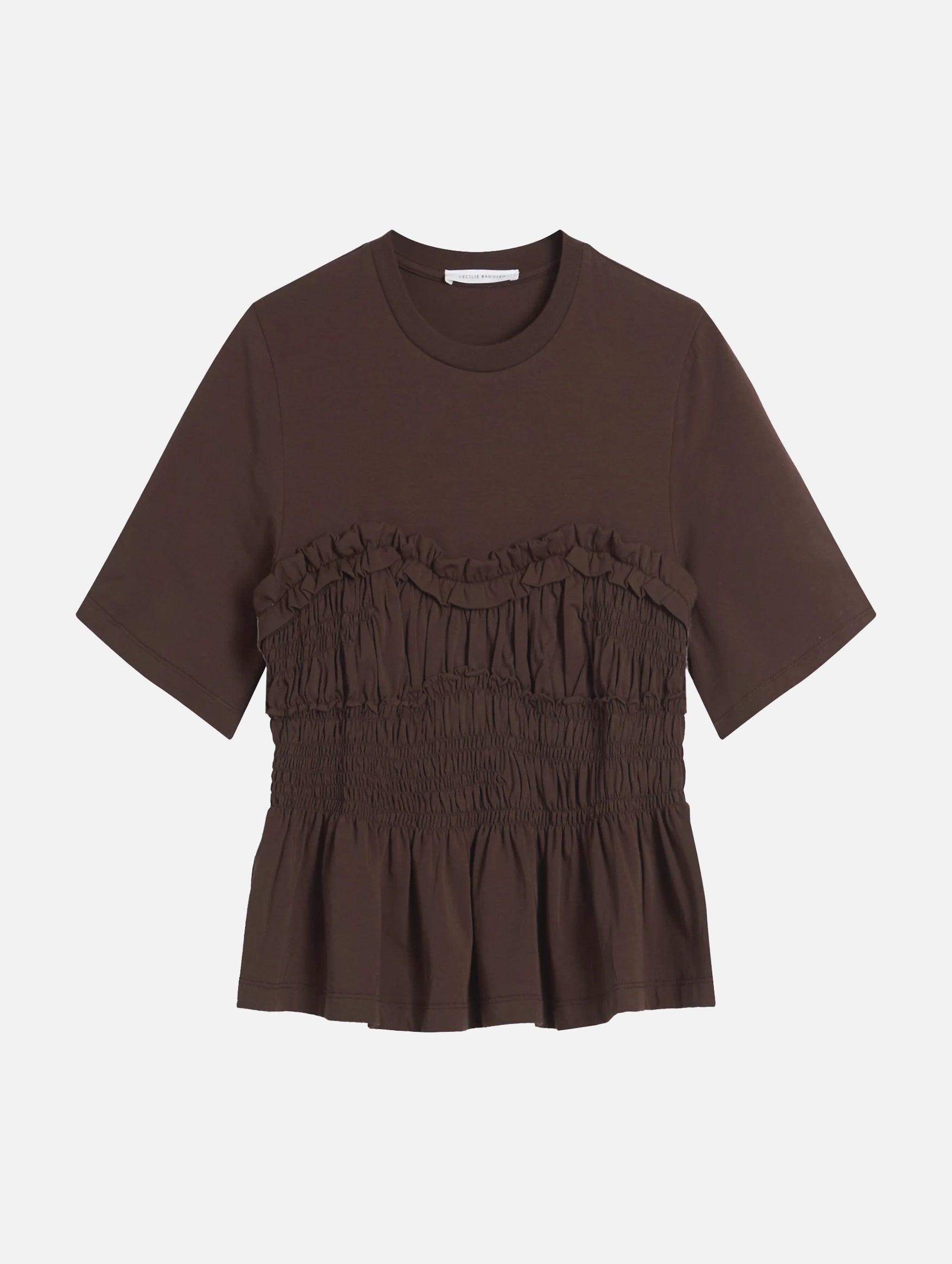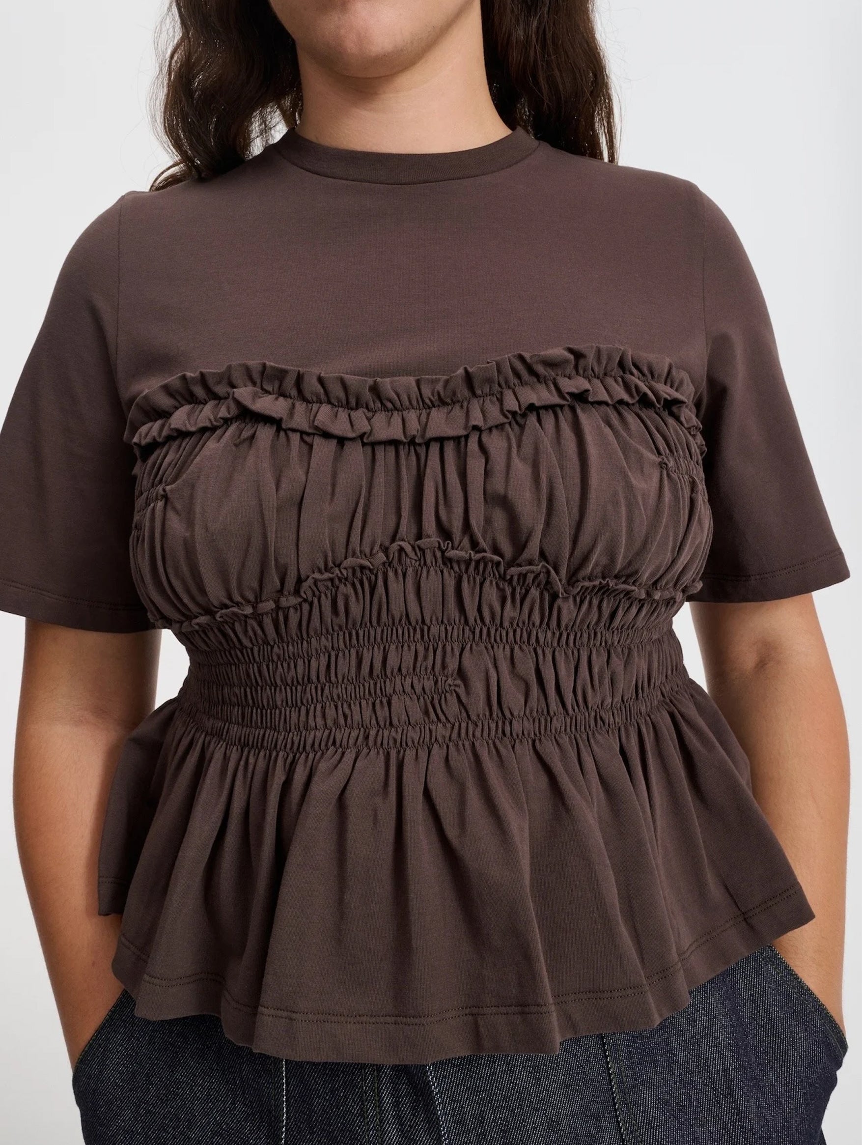 The Cecilie Bahnsen Vilde T-shirt’s ruched bodice transforms a casual staple into something sculptural. True to the brand’s signature aesthetic, it blends feminine form with unexpected texture, bringing a touch of couture to everyday dressing and showcasing Bahnsen’s romantic, minimalist design codes in wearable form.